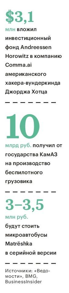За год существования проекта выпущено три «Матрешки», к концу 2016 года их будет пять, обещает Бакулин. Все пока работают в тестовом режиме на полигоне в «Сколково». По его словам, сейчас даже трудно сказать, какой компанией должна быть BMG — автомобильной или информационно-технологической.