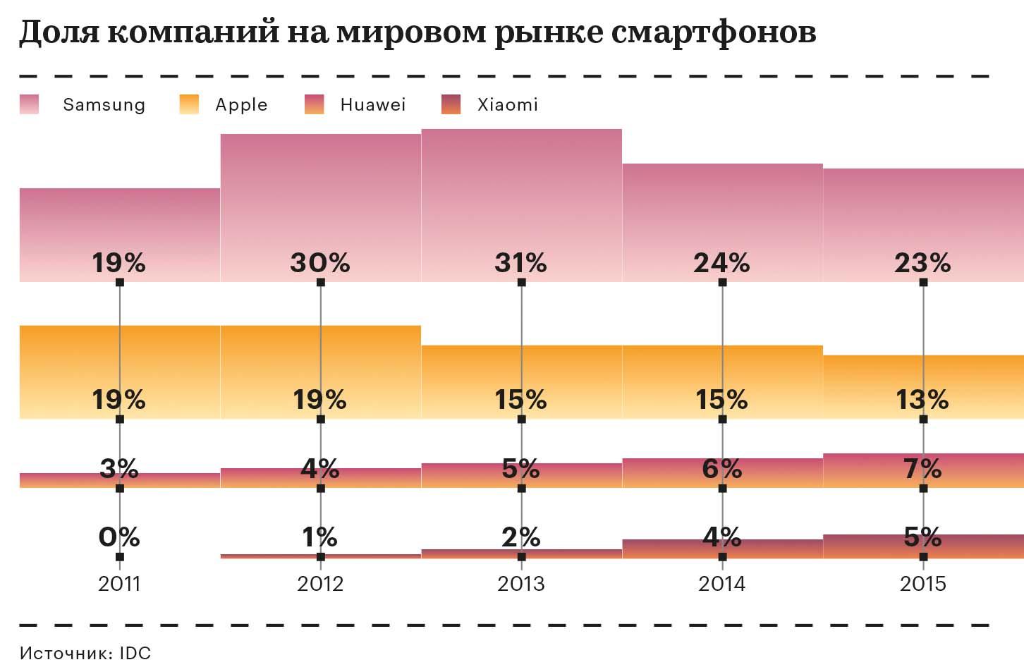 Xiaomi громко заявила о себе в 2014 году, когда ее продукция заняла третье место по популярности в мире после Samsung и Apple: китайская компания продала 61,1 млн смартфонов против 18,7 млн в 2013 году. В 2015 году рост был не таким мощным: по планете разошлось 70 млн телефонов Xiaomi. А в 2016-м, по данным компании IDC, Xiaomi выпала даже из пятерки мировых лидеров: ее вытеснили китайские Oppo и Vivo. Для возвращения позиций в Xiaomi решили осваивать новые рынки. В России Xiaomi пока занимает скромные позиции: старший аналитик «IDC Россия» Наталья Виноградова оценила долю компании на российском рынке смартфонов в 0,3%, в J’son & Partners Consulting этот показатель оценили в 0,7%. «И до, и после официального появления в России смартфоны Xiaomi хорошо продавались на сером рынке», — добавляет старший консультант J’son & Partners Consulting Алексей Тырков.