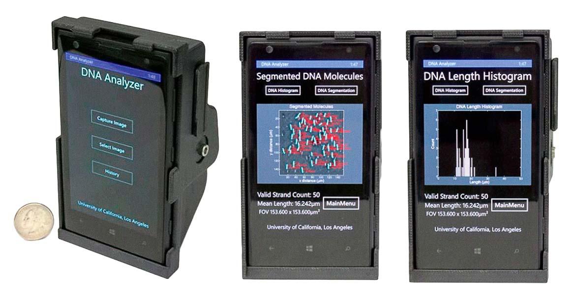 Насадка для смартфона, которая умеет анализировать ДНК человека, — изобретение с такой миссией представила в январе 2017 года в журнале Nature Communications группа ученых из Стокгольмского, Уппсальского и Калифорнийского университетов. Это легкий портативный микроскоп, который крепится на камеру мобильного устройства (пока он совместим с моделью Nokia Lumia 1020) и анализирует образцы ДНК на предмет мутаций, ассоциирующихся с целым рядом заболеваний, в том числе онкологических. Принцип работы прост: исследователь помещает образец ткани в контейнер, насадка-микроскоп «прочитывает» изображение биоматериала и делает вывод, есть ли в последовательности химических оснований ДНК отклонения, свидетельствующие о болезни. Результаты анализа выводятся на экран смартфона. В рамках экспериментов устройство успешно проанализировало раковые клетки с точностью, сравнимой с лабораторным оборудованием. Насадка, по оценке изобретателей, будет стоить не более $500, что вчетверо дешевле самых недорогих лабораторий для ДНК-анализа. Устройство призвано помочь развивающимся странам.