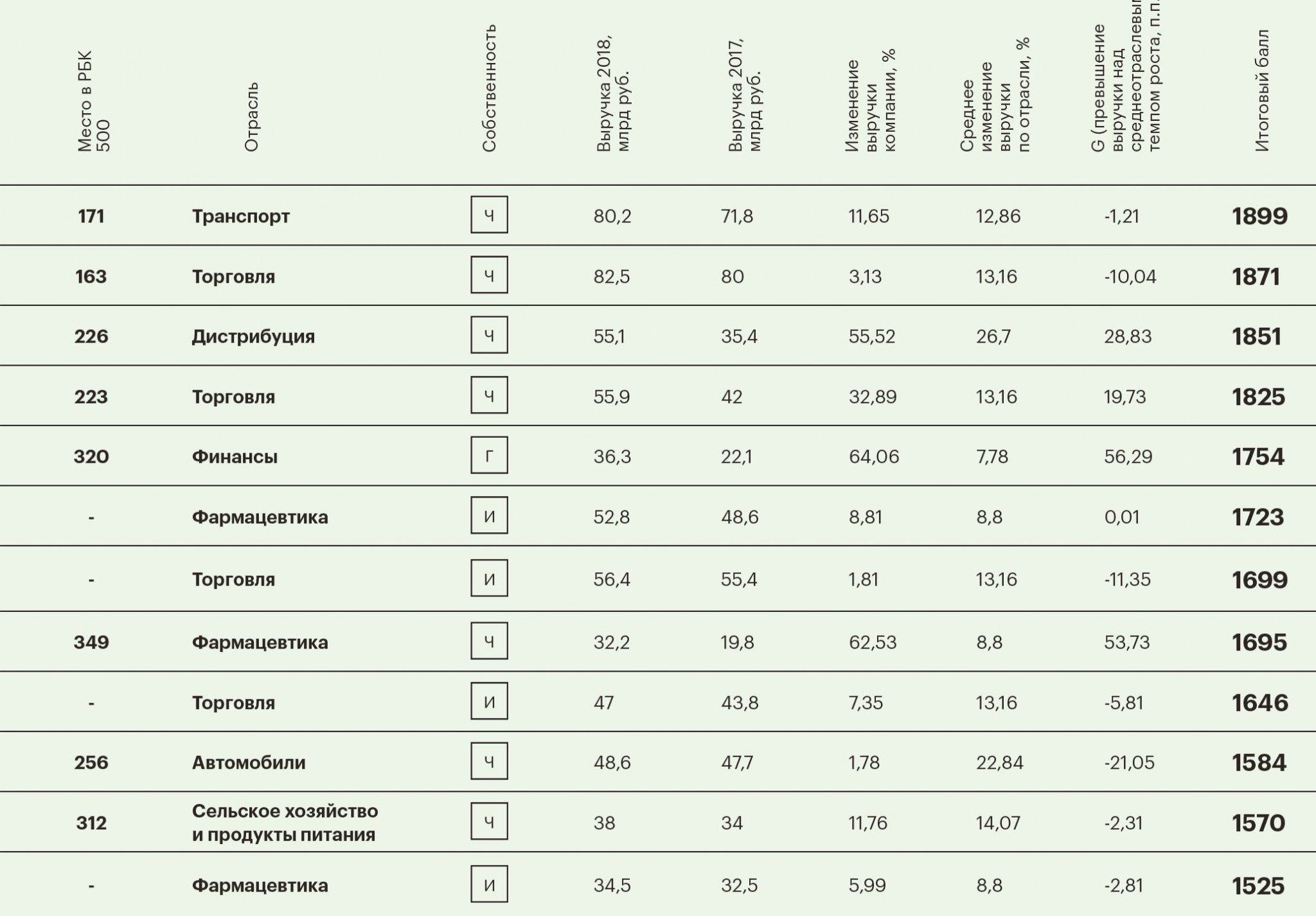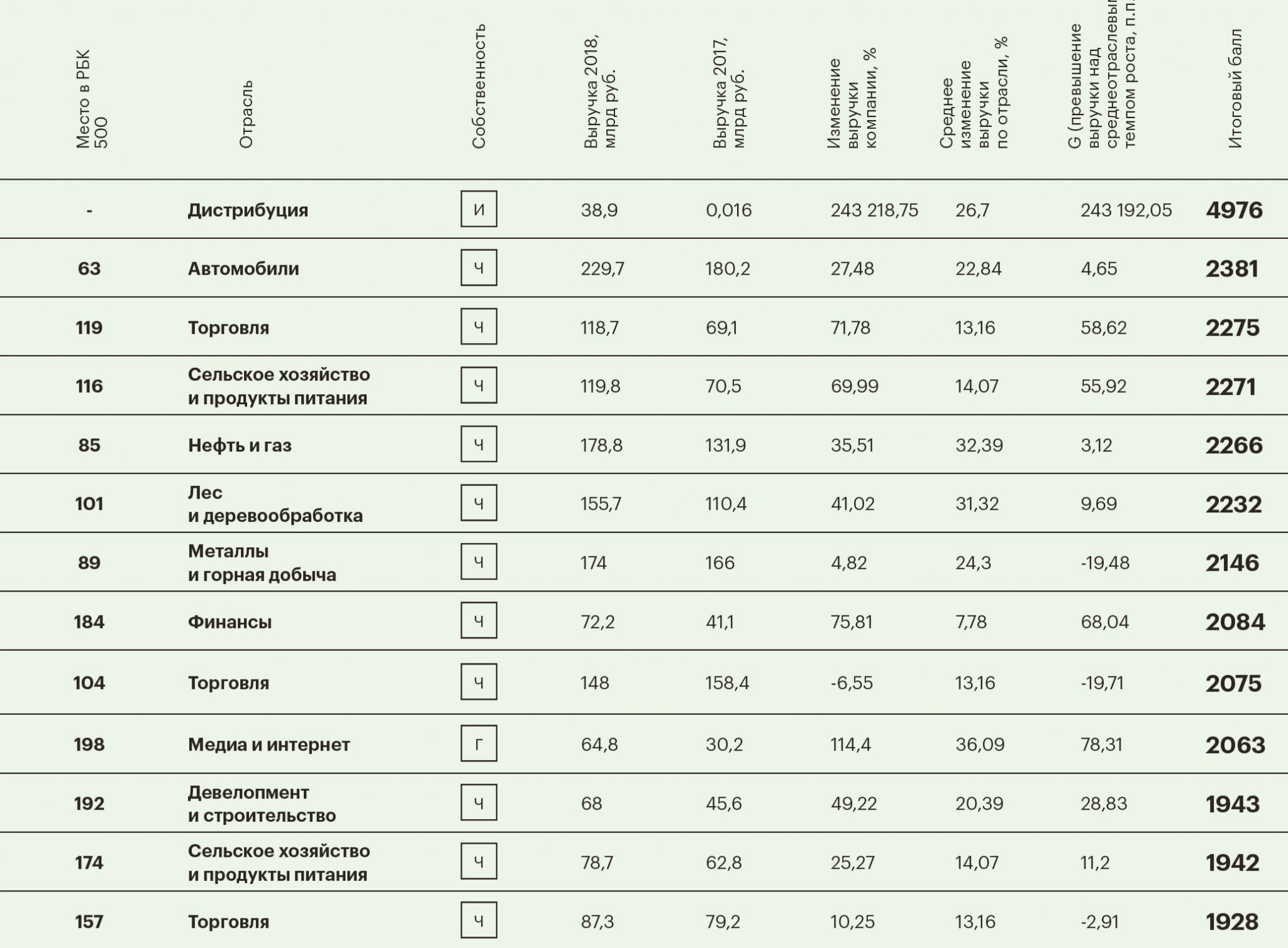 В этом году мы внесли изменения в расчет итогового балла. Теперь положение в рейтинге зависит от выручки возглавляемой компании (это основной показатель), корректируемой в зависимости от динамики выручки компании в 2018 году в сравнении с годовой среднеотраслевой динамикой выручки. Если компания провела год успешнее других компаний в среднем по отрасли, тем выше позиция руководителя в рейтинге.