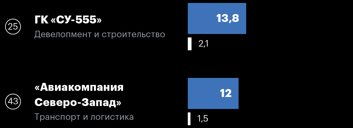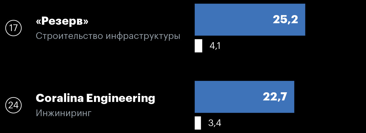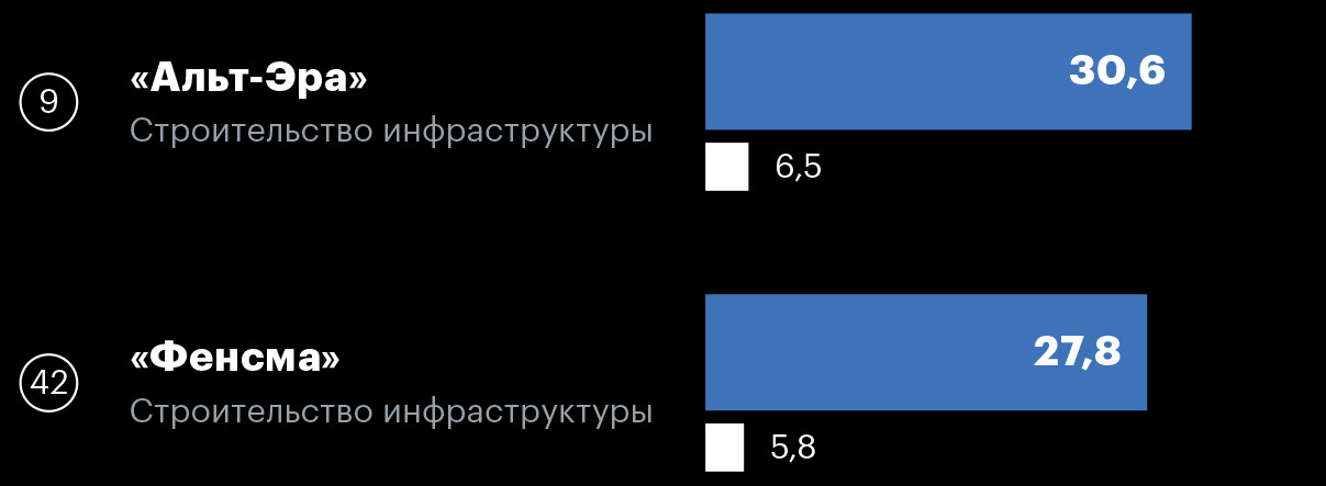 Второе место по численности — 12 компаний — занимает сектор инфраструктурного строительства. Среднегодовой рост суммарной выручки представителей этой отрасли составил 116,9%. На две самые многочисленные отрасли приходится половина топ-50 самых быстрорастущих компаний.