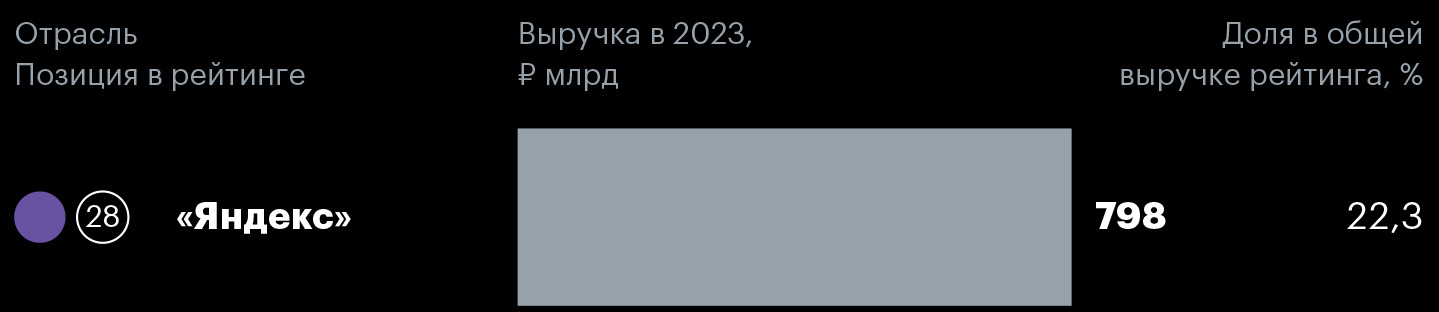 - Тем не менее в рейтинге три компании с выручкой более ₽300 млрд — годом ранее таких компаний было две. При этом у самой крупной компании рейтинга, «Яндекса», выручка превышает ₽700 млрд.