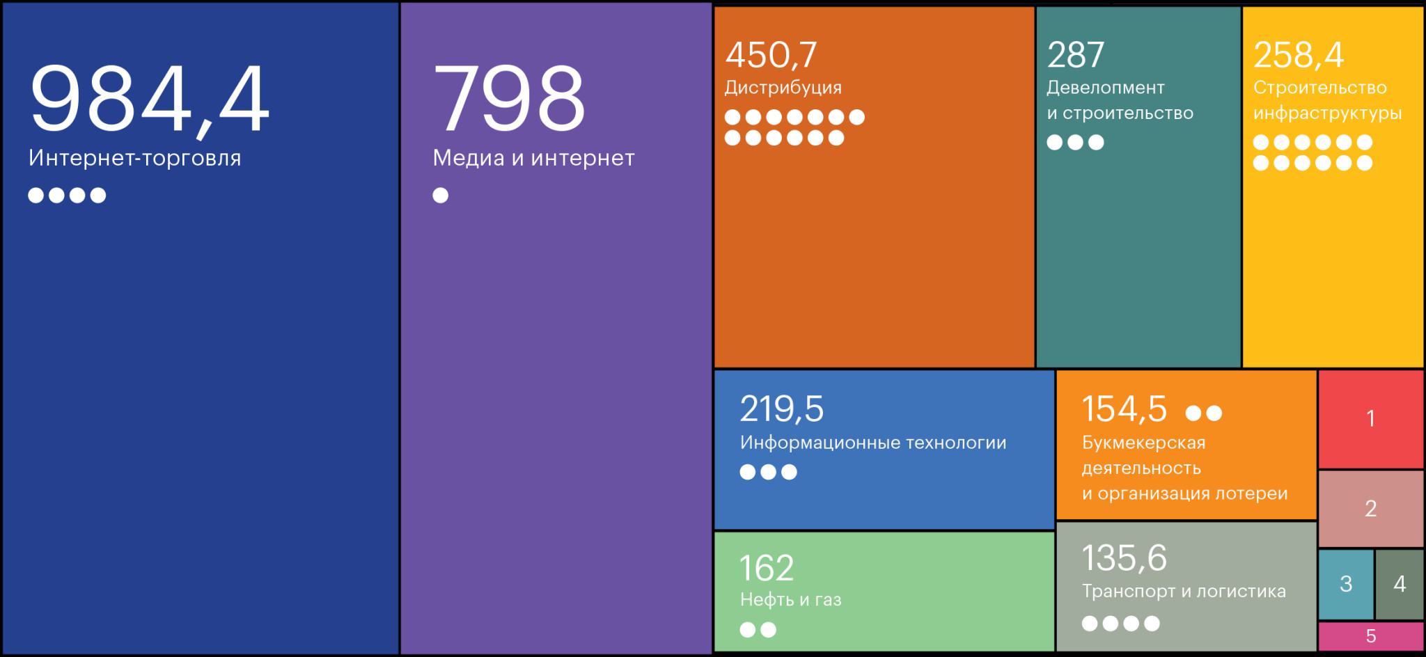 Несмотря на значительные темпы ежегодного роста этих отраслей — 126,8 и 116,9% соответственно, самой быстрорастущей отраслью рейтинга стал нефтегазовый сектор, показавший среднегодовой прирост 188,6%. А самым крупным сектором рейтинга стала интернет-торговля — на ее долю пришлось 27,6% всей суммарной выручки участников рейтинга за 2023 год.