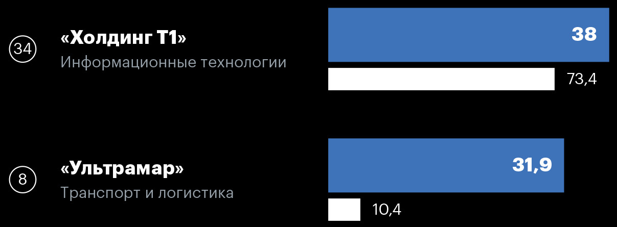 Самая большая прибыль в нынешнем РБК 50 — у IT-группы «Холдинг Т1» (₽73,4 млрд). Группа также является самой рентабельной компанией рейтинга с показателем маржинальности чистой прибыли 38%.