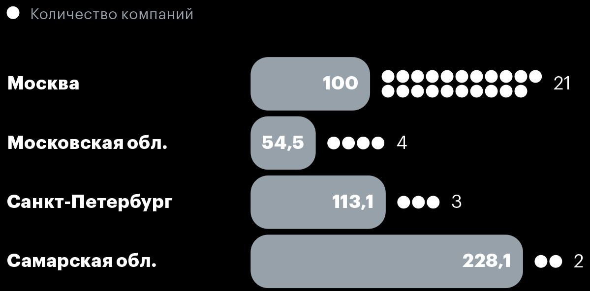 В региональном зачете столица лидирует с колоссальным отрывом — идущую следом Московскую область представляют уже только четыре компании. В итоге столичный регион представляет половина участников рейтинга РБК 50.