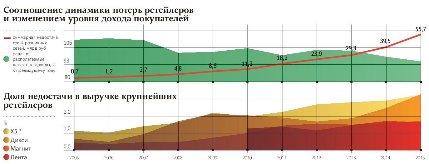 В 2015 году крупнейшие продовольственные ретейлеры России потеряли почти 56 млрд руб. — около 3% суммарной выручки — на кражах и порче продуктов. Десять лет назад этот показатель был менее 1% от общего оборота лидеров «съестного» ретейла