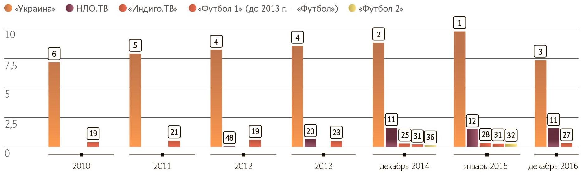 Источник: Индустриальный телевизионный комитет Украины; доля телесмотрения для аудитории 18–54 лет в городах с населением 50+ тыс. жителей