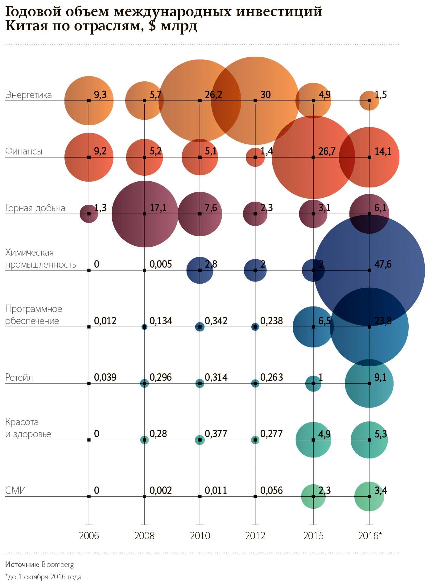 В структуре инвестиций Китая до 2013 года преобладали направления металлургии, добычи и энергетики. Крупные государственные корпорации в период «большого подъема» нуждались в дешевых ископаемых и энергии, поэтому скупали горнодобывающие предприятия в Австралии и Африке, а в Европе и Северной Америке — энергетические компании. Кризис и перенасыщение внутреннего рынка ресурсов, а главное — появление большого количества частных достаточно крупных для собственных инвестиций компаний привели к резкой смене направления вложений, но не уменьшили общие объемы. Китайские предприниматели активно вкладываются в технологии (китайские компании в 2015 году выкупили «дочку» IBM, собирающую серверы, а также крупного производителя микросхем Spreadtrum Communications Inc.). Их все больше интересует рынок сельскохозяйственной продукции.