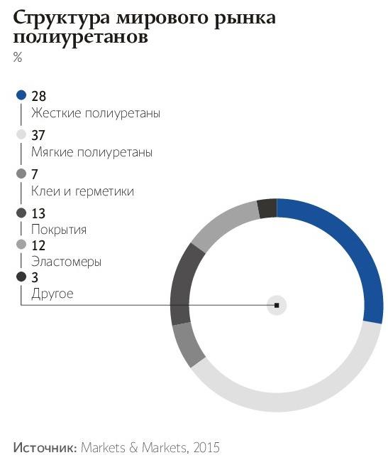 Широкое применение полиуретанов началось десятилетия назад, но именно сейчас они переживают эпоху расцвета. Суммарная емкость одних из самых широких сегментов этого рынка — твердых и мягких полиуретанов — сейчас оценивается в $46,05 млрд, а к 2021 году, согласно прогнозу Markets & Markets, достигнет $74,24 млрд. Растет спрос как на привычные, десятилетиями используемые виды продукции из полиуретана — пенопласты, поролоны, клеи и герметики, так и на новые материалы с уникальными характеристиками.