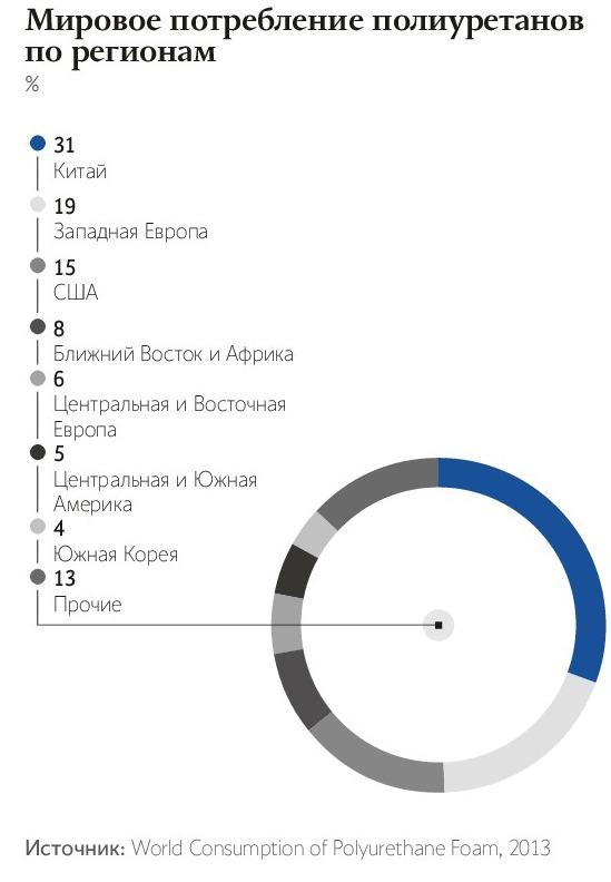 Традиционно главными потребителями твердых пенопластов были Северная Америка и Европа, однако сейчас сегмент прибавляет в основном за счет быстро растущих экономик Азии — Китая, Индии и Индонезии. По данным исследовательской компании Markets & Markets, спрос на полиуретаны в Азиатско-Тихоокеанском регионе составляет более трети от глобального спроса на эти материалы: 7,5 млн против 22 млн т в год, и почти весь объем в 2013 году приходится на долю Китая — остальным странам региона остаются единичные проценты. Сказывается бурная урбанизация населения в Поднебесной и вызванные ею ускорение темпов жилищного строительства и рост спроса на бытовую технику и мебель. В течение последних десяти лет спрос на полиуретан в Китае, по данным Utech Asia, ежегодно рос на 11,8%. В ближайшие десять лет, согласно прогнозу Grand View Research, спрос на полиуретан в Индии будет расти темпами, опережающими китайские, — 13,2% в год. Не последнюю роль в превращении Азии в лидера потребления этих материалов играет и перенос автомобильного производства в такие страны, как Таиланд, Вьетнам и Малайзия. Вплоть до 2020 года сегмент полиуретанов, используемых в автомобильной промышленности, будет прирастать в Азии на 5,3% ежегодно. Новые рынки возникают и растут не только в географическом смысле; например, растет востребованность новых категорий материалов. Так, согласно прогнозу Transparency Market Research, объем сегмента термопластичных полиуретановых пленок, который сейчас оценивается в $286,8 млн в год, к 2025 году почти удвоится, достигнув $516,9 млн. Примечательно, что эти пленки используются не только в традиционных сферах применения полиуретанов — строительстве и производстве автомобилей, но и в новой для них аэрокосмической отрасли.