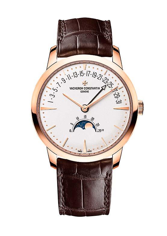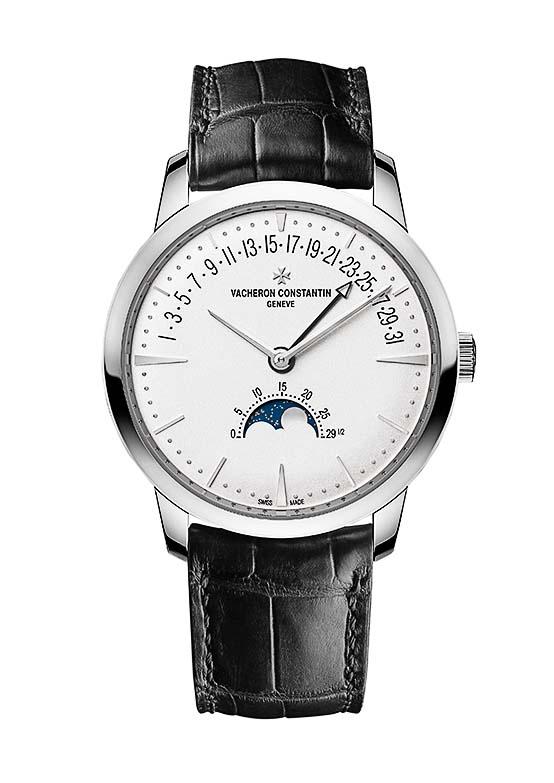 Новые часы Patrimony в полной мере демонстрируют приверженность марки чистому минималистичному дизайну. Посеребренный циферблат не перегружен деталями и вместе с тем отображает два серьезных усложнения. Шкала даты расположена полукругом в верхней части циферблата, значения отмечает черная ретроградная стрелка с наконечником. Индикатор лунных фаз показывает не просто картину лунного диска, но и конкретный цикл от 0 до 29 с половиной дней. Механизм требует корректировки раз в 122 года.