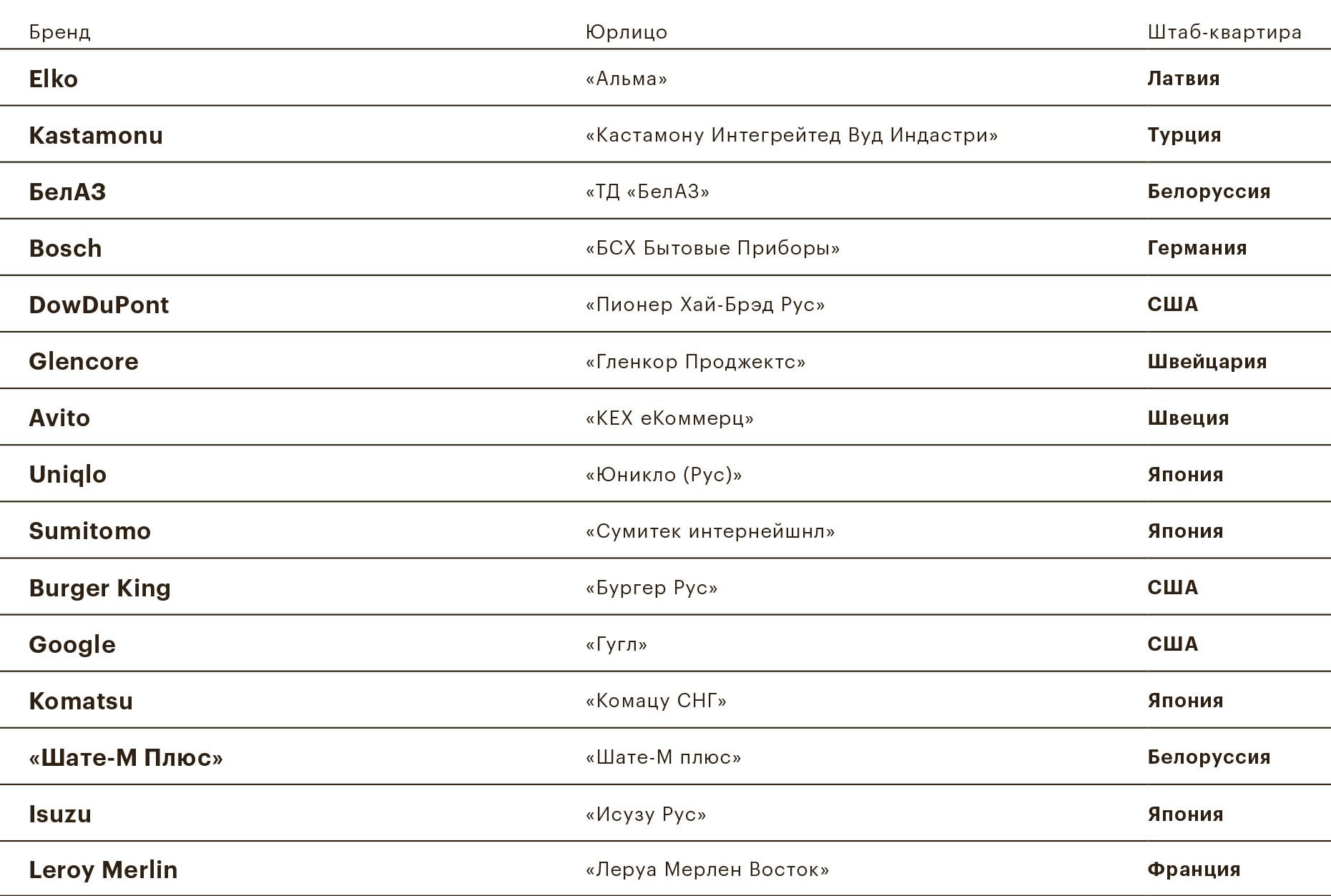 Главная тенденция рейтинга-2018 — рост темпов бизнеса японских компаний. У представителей азиатской страны — сразу четыре позиции в топ-15: сеть магазинов одежды Uniqlo, машиностроители Sumitomo и Komatsu, а также гигант автопрома Isuzu. Прошлогодний лидер — США — на этот раз делегировал в список лишь три компании: DowDuPont, Burger King и Google. Два представителя у Белоруссии — БелАЗ и продавец автозапчастей «Шато-М Плюс». Самый же быстрорастущий иностранный бизнес — юрлицо латвийского дистрибьютора ИT-продуктов Elko.
