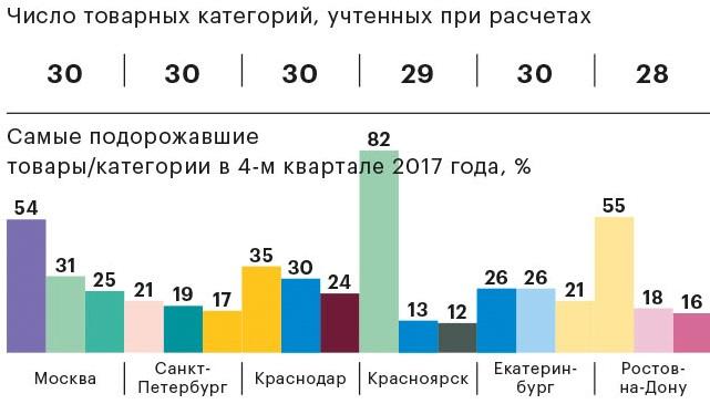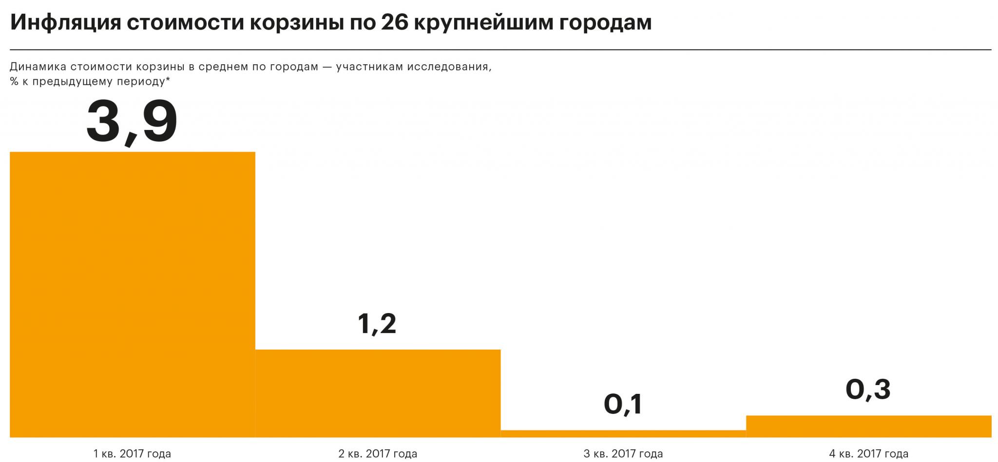 * Показатель подсчитан по формуле «стоимость корзины текущего периода», деленная на «стоимость корзины предыдущего периода», и выражен в %. При этом вес конкретных товарных категорий — вес равен доле цены товара в общей стоимости сформированной нами потребительской корзины — взят из предыдущего периода
