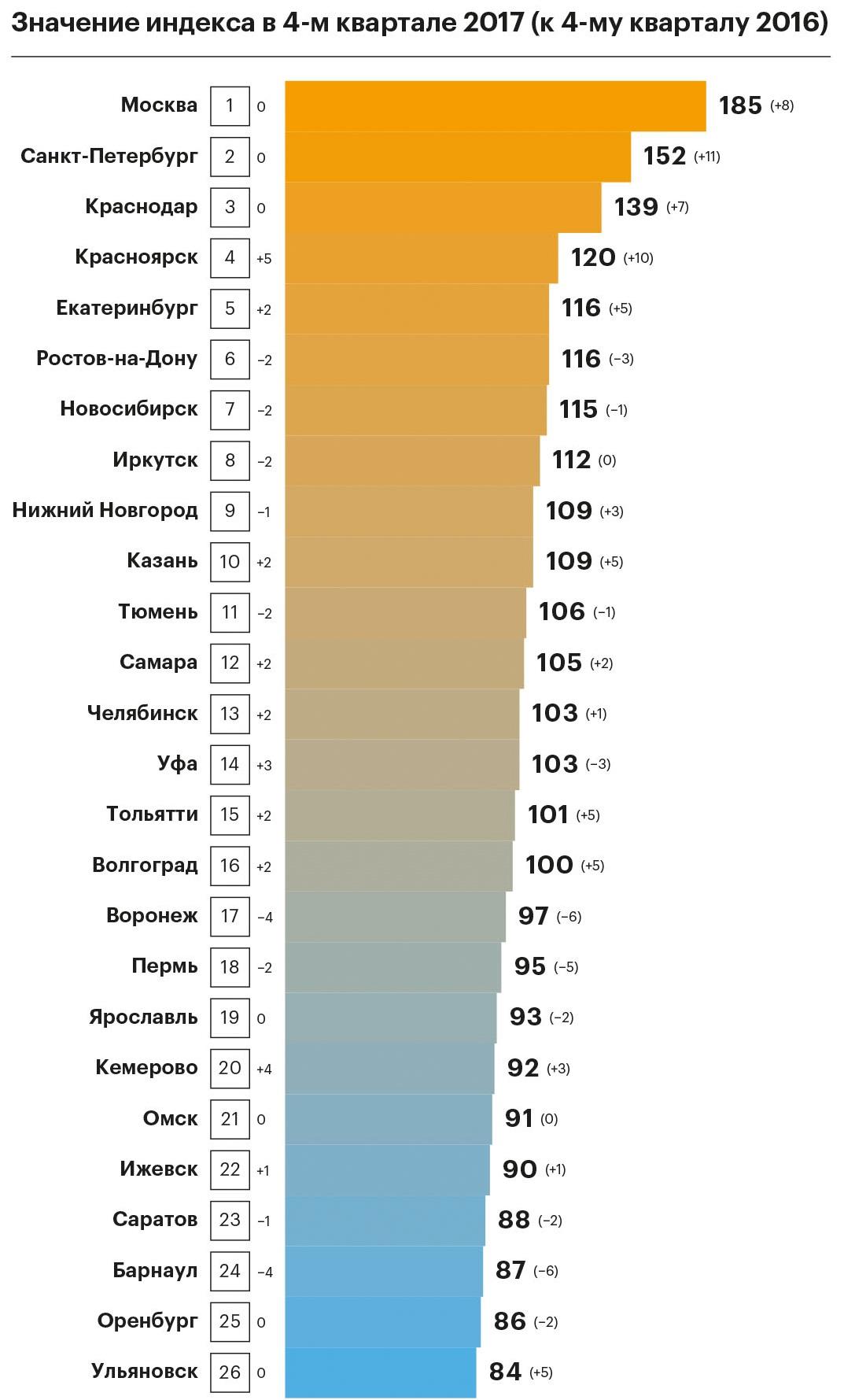 Подробная разбивка по отдельным кварталам и городам дает более сложную и неоднозначную картину. К примеру, в Красноярске значение индекса в четвертом квартале 2017 года выросло на 12,1 пункта, в Краснодаре — на 11,6 пункта, в Уфе и Омске за тот же период индекс упал на 3,7 и 4,8 пункта соответственно.