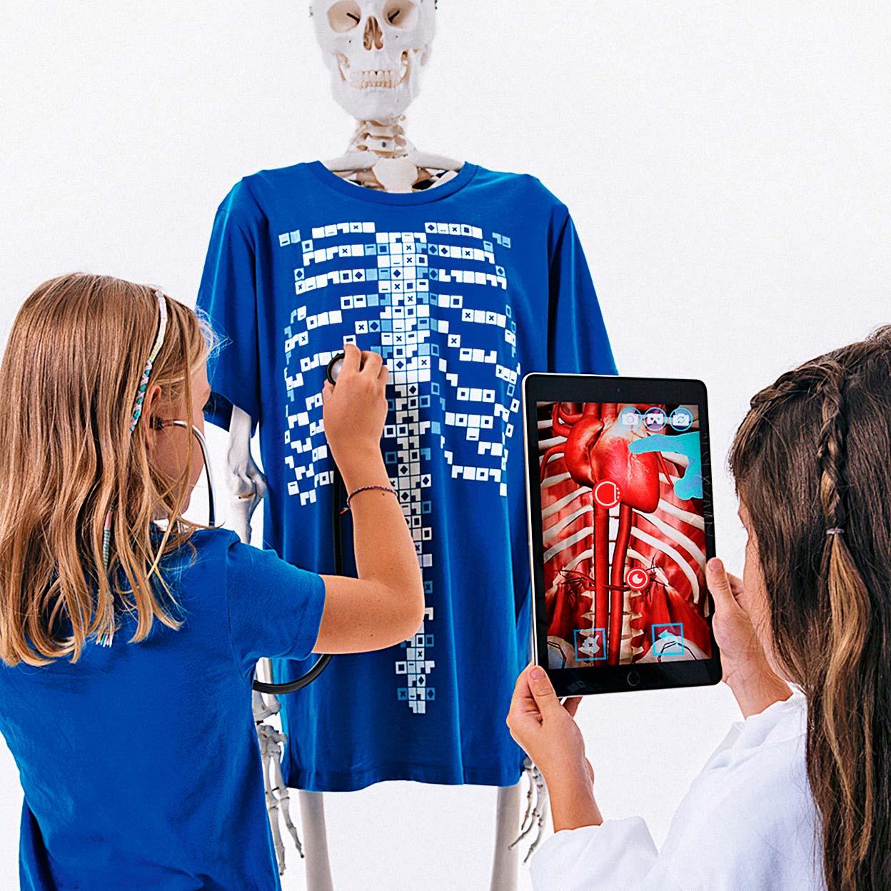 Голубые футболки с принтами-скелетами от британского стартапа Curiscope не костюм на Хеллоуин, а настоящий портал в мир дополненной реальности. Схематично изображенные на ткани кости, смахивающие на кроссворд, — это QR-код. Запустив на смартфоне бесплатное приложение, пользователь может заглянуть «внутрь» человеческого тела и изучить устройство грудной клетки или кишечника.
