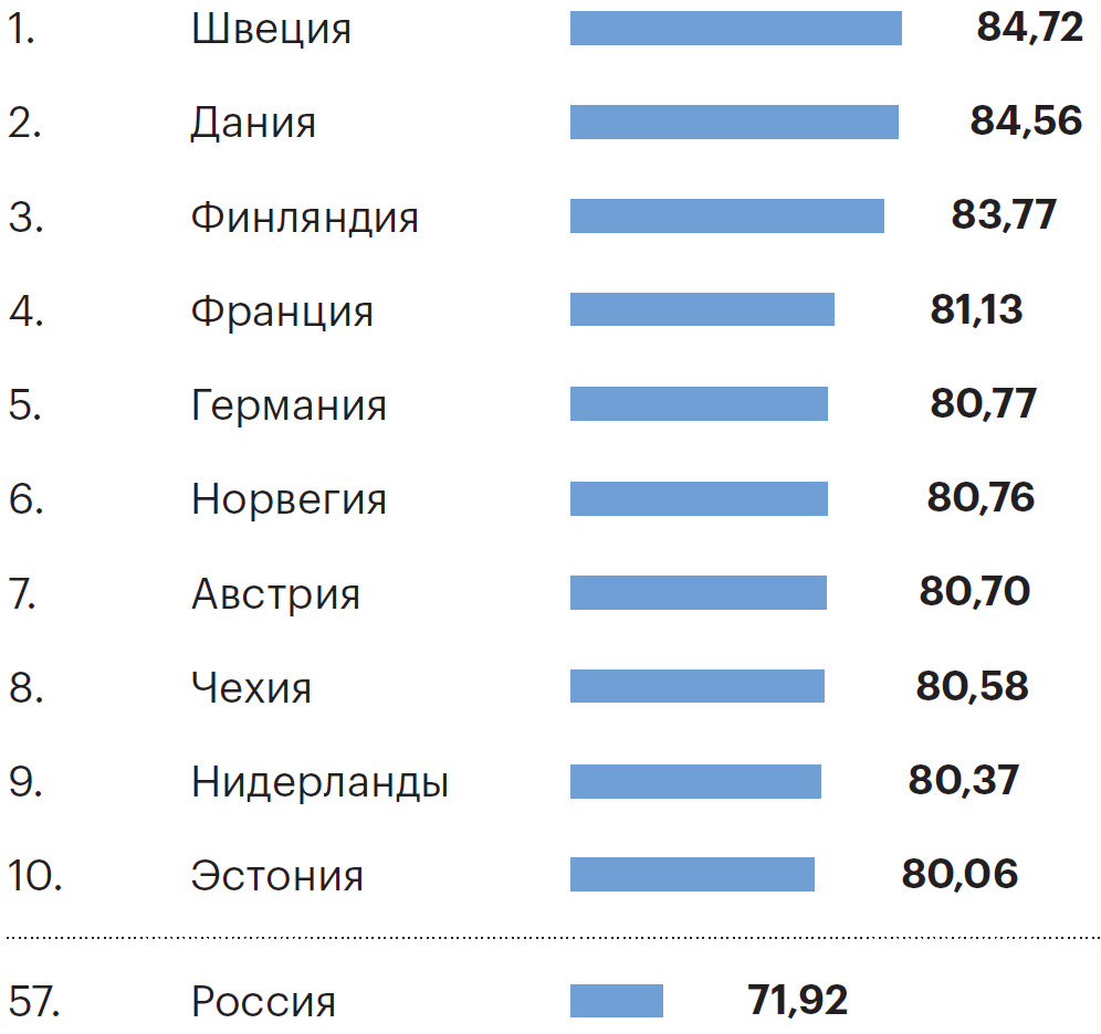 Для оценки достижений стран был создан специальный Индекс прогресса по ЦУР (SDG Index — Sustainable Development Goals Index). В прошлом году рейтинг возглавили Швеция, Дания и Финляндия. Россия в Индексе прогресса по ЦУР за 2020 год оказалась на 57-м месте, тогда как в 2019 году занимала 63-ю строчку.