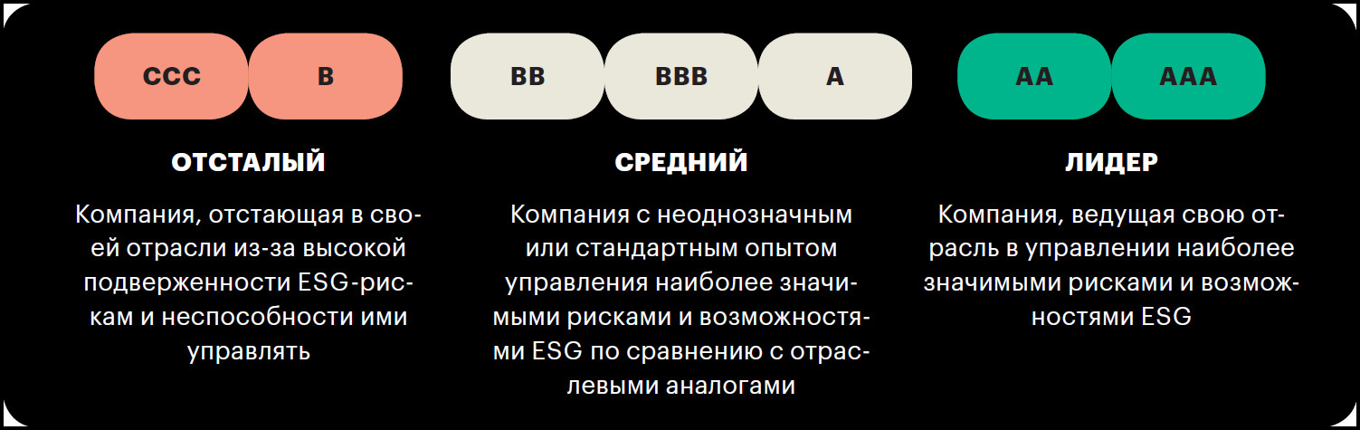 MSCI делит компании на три категории: лидеры с рейтингом AA и AAA, компании со средними показателями — A, BBB, BB и отстающие — B, CCC.