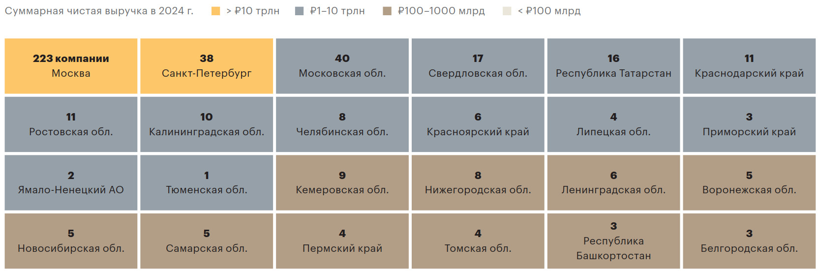 Как правило, крупнейшие компании действуют в нескольких регионах страны, а часто и за рубежом. Тем не менее у любой компании есть свой «порт приписки» — адрес юридической регистрации. Приведенное ниже распределение компаний из рейтинга РБК 500 сделано по месту регистрации отдельных юридических лиц или головных компаний групп. Поэтому распределение выручки по регионам следует понимать скорее условно. Регион регистрации определен по коду причины постановки на налоговый учет (КПП). У двух участников зарубежной регистрации головных компаний указана страна регистрации.