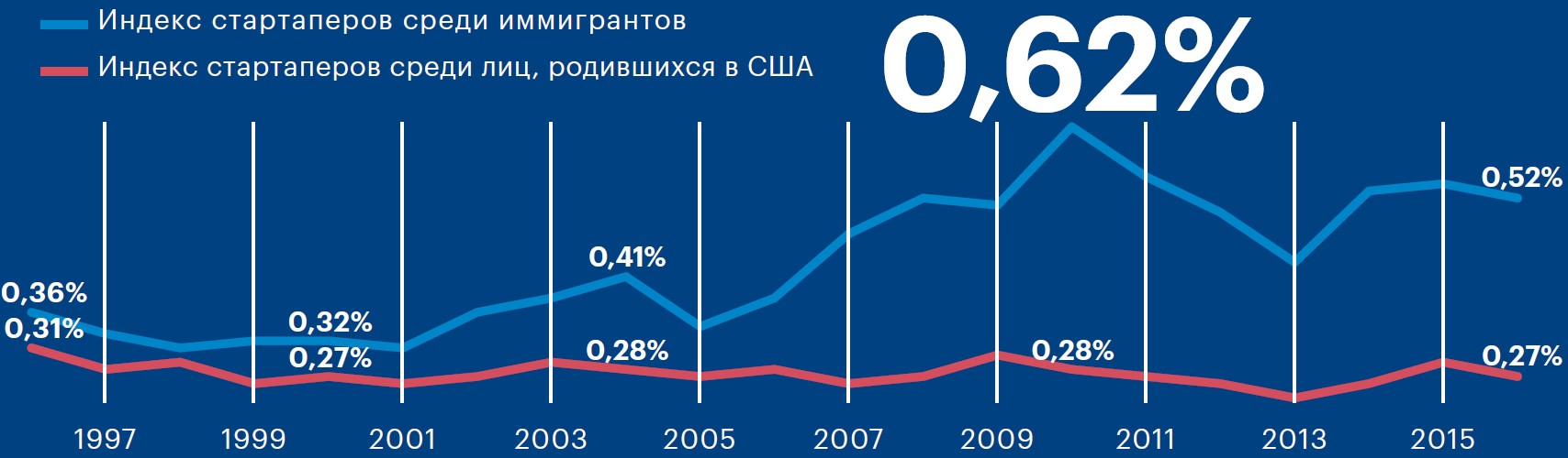 Некоммерческая организация Kauffman Foundation каждый год изучает предпринимательский ландшафт США и собирает максимально подробную информацию о лицах, создающих новые бизнесы в стране. Один из параметров исследования — место рождения стартаперов. Индекс Kauffman учитывает, сколько новых предпринимателей приходится на 100 тыс. совершеннолетних лиц из данной группы в отчетный период. То есть, к примеру, показатель 0,25% означает, что в среднем из 100 тыс. населения, относящегося к данной группе, каждый месяц отчетного года 250 человек основывали бизнес. Как следует из данных Kauffman, иммигранты как предприниматели традиционно активнее американцев во втором и более поколениях. В итоге доля «приезжих» стартаперов за 20 лет выросла вдвое, до рекордных почти 30% в 2016 году.