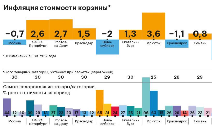 Журнал РБК продолжает мониторить уровень цен и динамику их изменений в 26 крупнейших городах России (результаты предыдущих кварталов опубликованы в выпусках №3 и №6 за 2017 год). В этот раз мы проанализировали, как поменялась стоимость собранной нами так называемой потребительской корзины, состоящей более чем из 30 категорий товаров и услуг, во втором квартале года: что в обозначенном периоде подорожало, а что, наоборот, подешевело и каков средний показатель инфляции по всем населенным пунктам, попавшим в финальную выборку исследования.