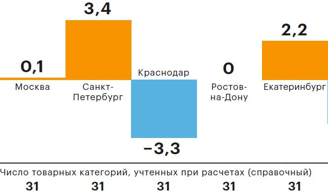 В шести городах — Москве, Ростове-на-Дону, Иркутске, Казани, Саратове, Барнауле — ценник на потребительскую корзину не изменился. Годовая инфляция «набора» в среднем по всем 26 крупным городам тоже близка к нулю — 0,1%. В предыдущем квартале инфляция корзины была чуть выше 1,2%.