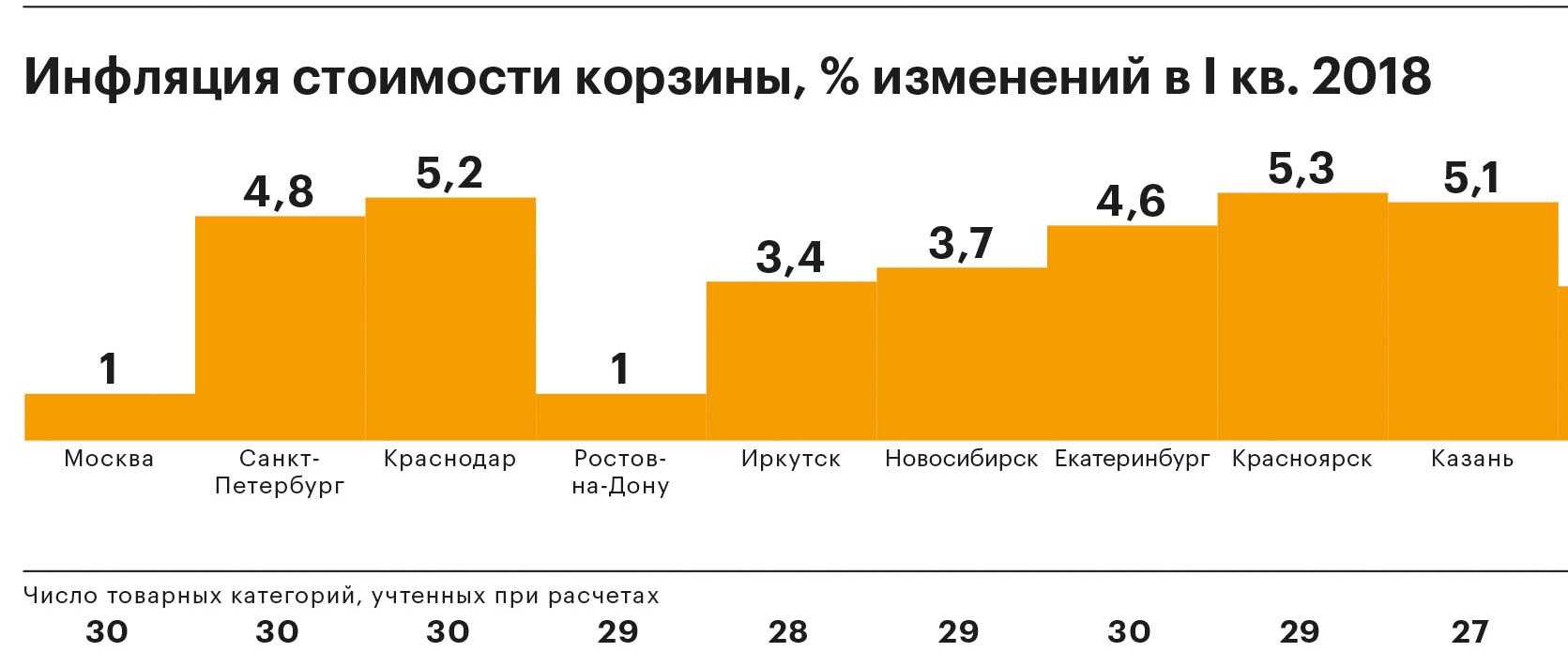 В этот раз мы проанализировали, как поменялась стоимость собранной нами потребительской корзины, состоящей более чем из 30 категорий товаров и услуг, в первом квартале 2018 года: что в обозначенном периоде подорожало, что подешевело и каков средний показатель инфляции по всем городам, попавшим в финальную выборку исследования. Тройка самых дорогих городов в первом квартале осталась неизменной — Москва, Санкт-Петербург, Краснодар, сильнее всего жизнь подорожала в Красноярске и Тольятти, которые поднялись в индексе сразу на четыре позиции. Чемпионом по снижению стоимости жизни стал Воронеж, опустившийся на три позиции.