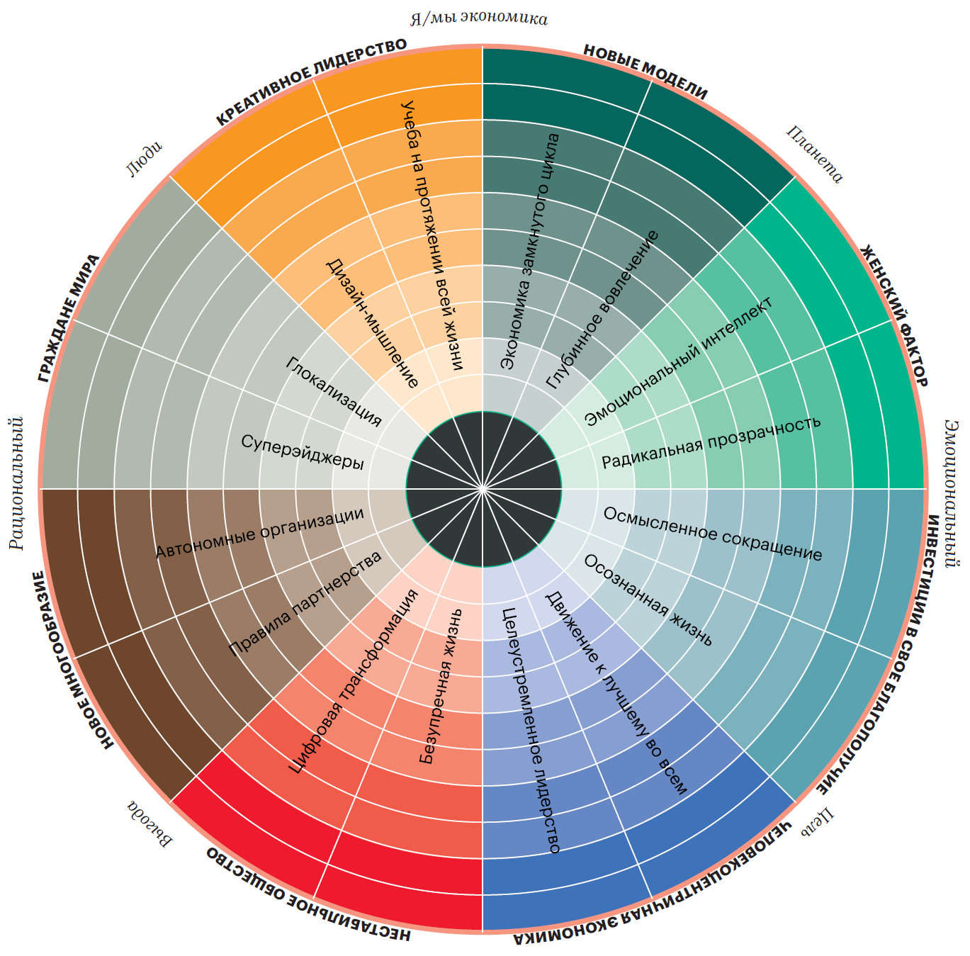Каждому макротренду назначается несколько поддерживающих микротрендов. Вы можете выбрать, например, от двух до четырех микротрендов для каждого макротренда. Каждый из микротрендов помещается в сектор или квадрант, соответствующий одному из 4P (люди, планета, цель или прибыль), для создания сбалансированной перспективы будущего в выбранном секторе или отрасли. Также в индексе есть две оси. У горизонтальной на разных полюсах — рациональные (поддающиеся более точной оценке) и эмоциональные (касающиеся ценностей, духовной стороны жизни и т.д.) тренды, у вертикальной — коллективные и индивидуальные.