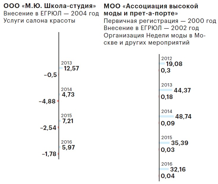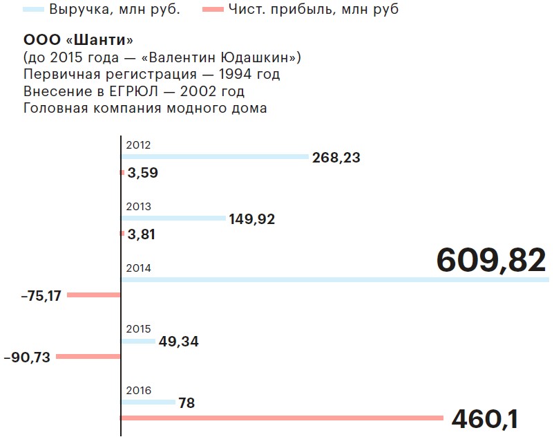 Модный дом Юдашкина никогда не публиковал данные о продажах, а отчетность компаний кутюрье в СПАРК выглядит странно. В 2016 году совокупная выручка компаний «Шанти» и «Димакс», через которые идут продажи модной одежды и аксессуаров Valentin Yudashkin в России, составила 84,9 млн руб., а их совокупная чистая прибыль была в восемь раз больше — 682 млн руб. Более свежих данных нет, и это самые высокие показатели за все время. Но это далеко не весь бизнес, в котором участвует Юдашкин или хотя бы его имя.