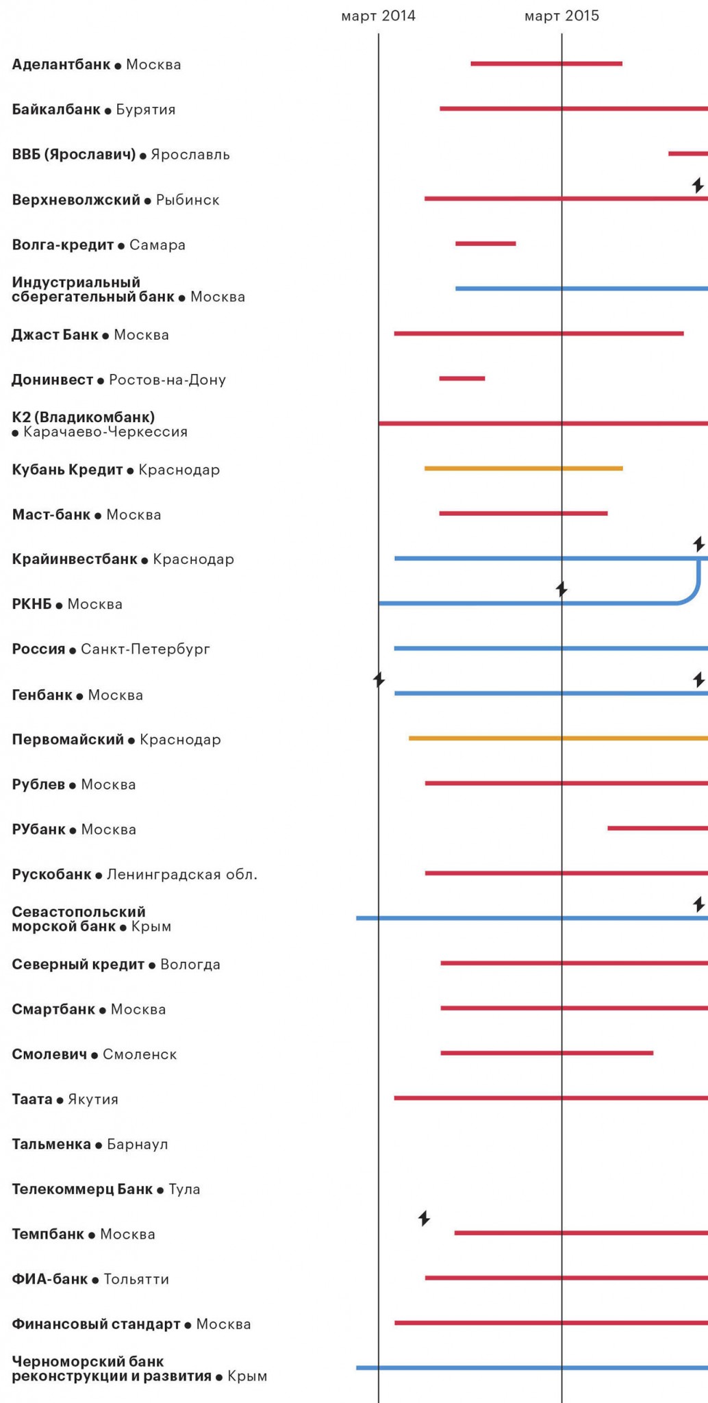 Первым пал «Донинвест», совладельцем которого был продюсер легендарной группы «Ласковый май» Андрей Разин. Лицензия у банка была отозвана в октябре 2014 года, спустя несколько месяцев после открытия одного офиса в Симферополе. Как выяснилось впоследствии в рамках процесса банкротства, для вывода денег использовались, помимо всего прочего, фиктивные сделки с недвижимостью в Крыму. Основная «зачистка» произошла в 2015–2017 годах, когда из-за действий Центробанка полуостров лишился 45% общего числа пришедших банков (13 кредитных организаций). В 2017–2018 годах аналогичная участь постигла еще четверть учреждений. Лишь к двум, Крайинвестбанку и Генбанку, была применена более мягкая мера надзорного реагирования — введение временной администрации и дальнейшая санация. У обоих в числе акционеров было государство.