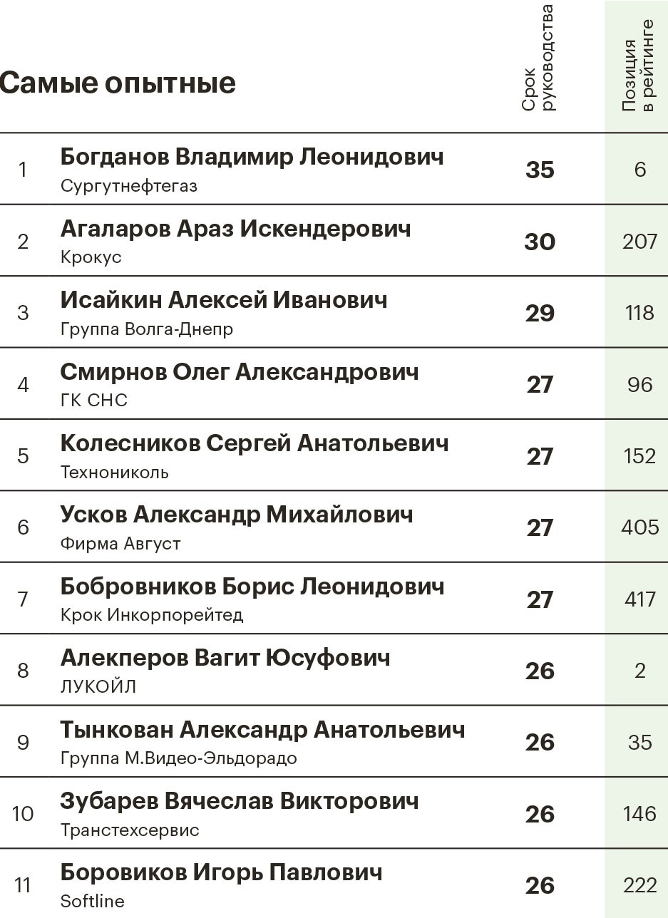 Если рассмотреть стаж руководства компаниями, а здесь мы располагаем данными по 496 участникам рейтинга, то налицо тенденция «свежей крови» — более половины руководителей возглавляют свои компании не более пяти лет. При этом в рейтинге руководителей есть и настоящие патриархи.