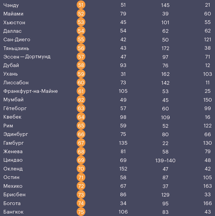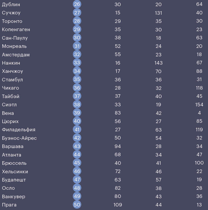 Уровень развития урбан-среды менее всего разделяет города-лидеры. Но здесь важно другое: современные технологии, например публичный Wi-Fi, покупают и внедряют почти все города мира, однако масштабно создают инновации и притягивают творцов технологий и смыслов лишь единицы.