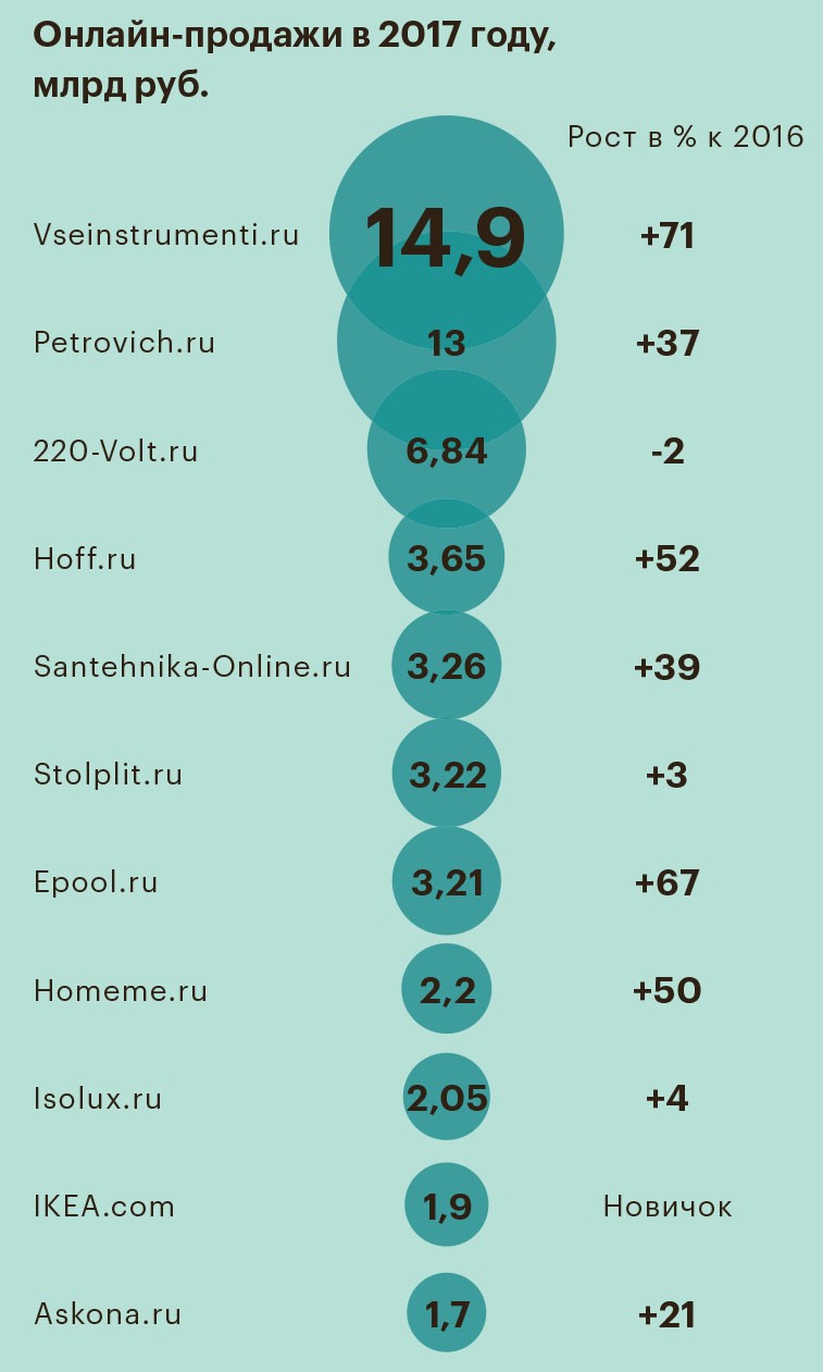 Новичок рейтинга быстрорастущих компаний «ВсеИнструменты.ру» начинал бизнес на рынке товаров для дома и ремонта, когда эта ниша была сравнительно свободна, и до сих пор остается онлайн-магазином №1 в этом сегменте. Всего у компании 200 тыс. наименований товаров, а в 2017 году ее выручка выросла на 66%, до 13,4 млрд руб.