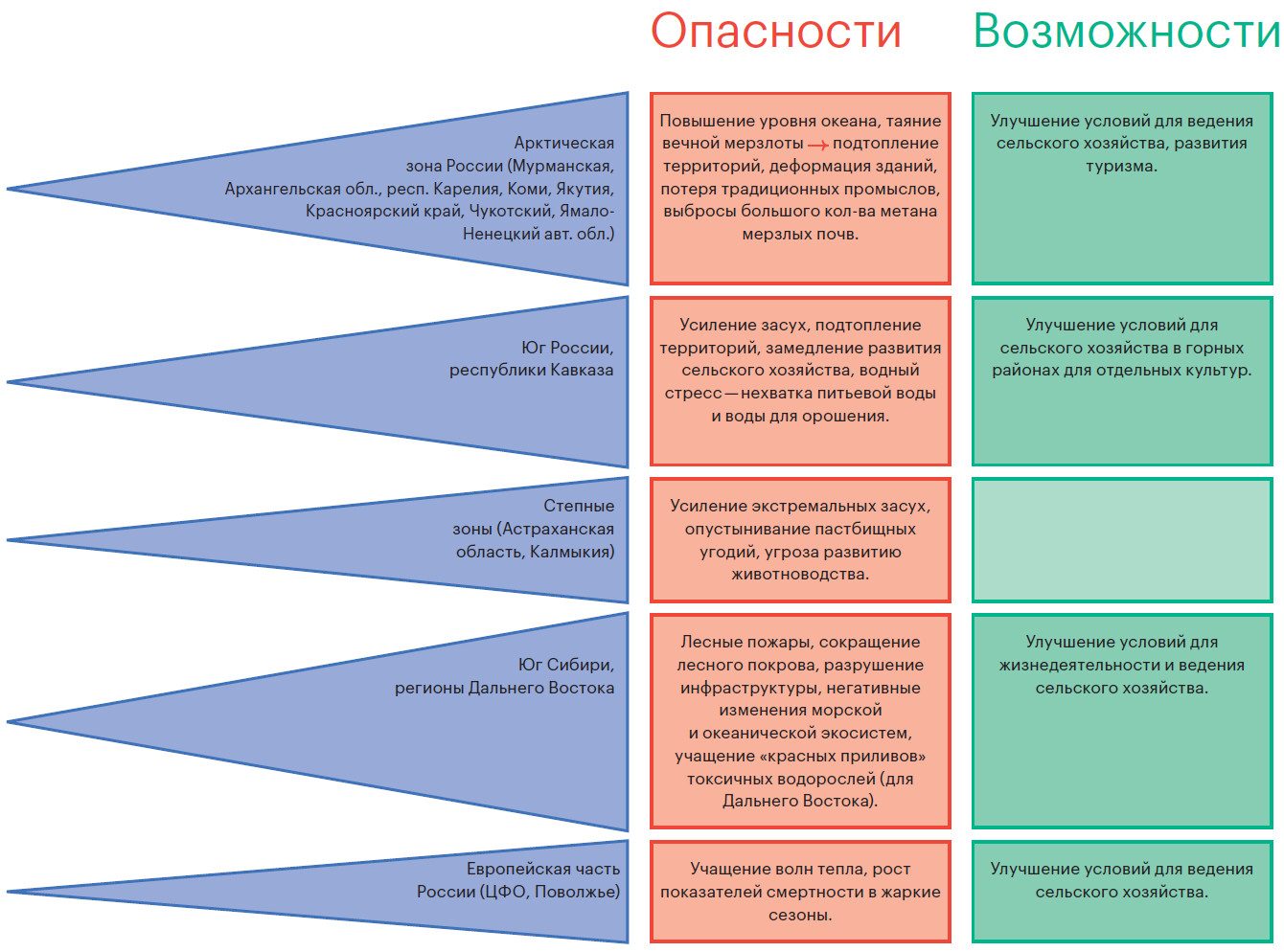 Кроме серьезных негативных последствий авторы доклада «Воздействие изменения климата на человеческий потенциал, экономику и экосистемы» также говорят о возможности улучшения условий для жизни и ведения сельского хозяйства в Сибири и таежных регионах Центральной России. Повышение температур может сделать северные территории благоприятными для развития органического сельского хозяйства и туризма, возведения инфраструктуры. Эти факторы также могут спровоцировать переселение людей на эти территории из регионов, где изменение климата приведет к ухудшению условий жизнедеятельности в будущем. Одним из таких регионов может стать юг России.