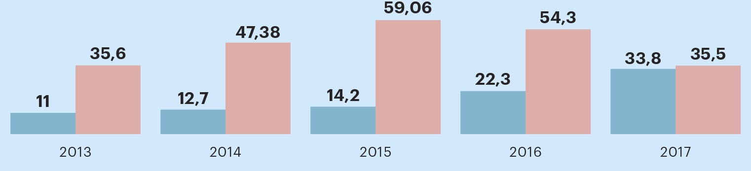 Постепенно X5 Retail Group вернула себе утраченные позиции: в конце 2016 года она обошла «Магнит» по размеру квартальной выручки, а окончательно вышла на позицию лидера продуктовой розницы по итогам 2017 года, в котором доля X5 составила 9,5% против 7,5 у «Магнита». И, конечно, опередила конкурента по размеру годовой выручки — 1,29 трлн руб. против 1,14 трлн руб. у «Магнита».
