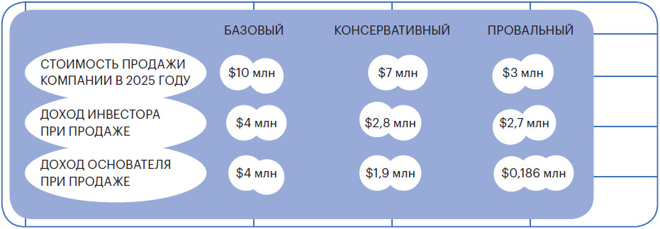 3. Провальный: компания не развивается по плану, и ее удается продать лишь за $4 млн в 2025 году. В этом сценарии имеет значение ликвидационная привилегия. Инвестор получает назад вложенные средства с минимальной доходностью на инвестиции 8% годовых. Это примерно $2,7 млн. Другим участникам, включая основателя, достаются оставшиеся средства от продажи. Таким образом, основатель получит всего около $186 тыс. Если компания будет продана еще дешевле, то основатель может и вовсе ничего не получить.