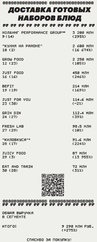 «Впрочем, на сегменте доставки готовых рационов питания и продуктовых наборов пандемия отразилась скорее позитивно. Во время карантина большое число людей смогли попробовать здоровую еду с доставкой на дом. После снятия ограничений на работу кафе и ресторанов снижения объема заказов у нас не было. С середины 2020 года рынок продолжает расти во многом за счет нового опыта, который появился у клиентов во время самоизоляции», — говорят в Performance Group, объединяющей сервисы Performance Food, LevelKitchen, My Food и Chef at Home.