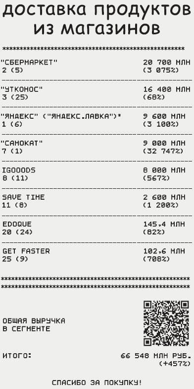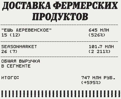 На рынке, считают в Performance Group, начинается консолидация, когда рост компаний становится неравномерным (в 2015– 2019 годах все росли одинаково, на уровне 50–70%). «Очевидно, что в лидерах по росту выручки оказались компании, работающие в сфере доставки продуктов/готовой еды и маркетплейсы, — говорит директор по акселерации кластера биомедицинских технологий фонда «Сколково» Наталья Крашенинник. — И в допандемийные времена данный сегмент демонстрировал устойчивый рост, но в условиях ограничений и изоляции прирост стал буквально геометрическим. Тенденция на укрупнение лидеров сохранится, поскольку клиентам удобно заказывать самый широкий ассортимент в одном приложении в сочетании с удобной и быстрой доставкой».