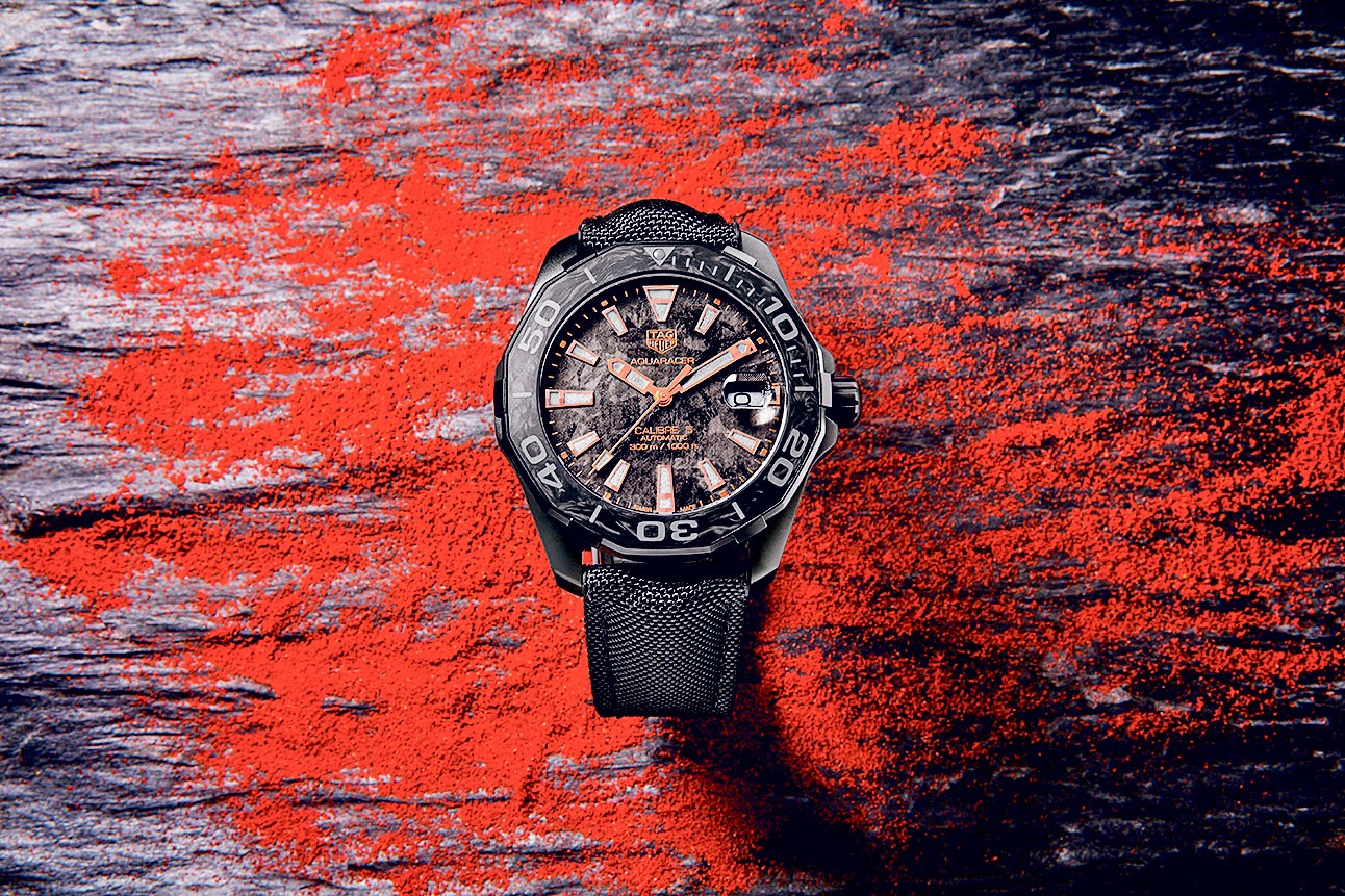 Три новые модели обновленной серии спортивных часов Carbon Aquaracer получили герметичный (погружение на глубину до 300 м) титановый корпус с PVD-покрытием, из карбона изготовили безель. Кристаллический узор «под углеволокно» на циферблате сделан методом тиснения, на этом темном матовом фоне у каждой модели Aquaracer расставлены свои цветовые акценты — синие, желтые и оттенка розового золота. Автоматический калибр TAG Heuer 5 управляет работой трех стрелок и индикатора даты.