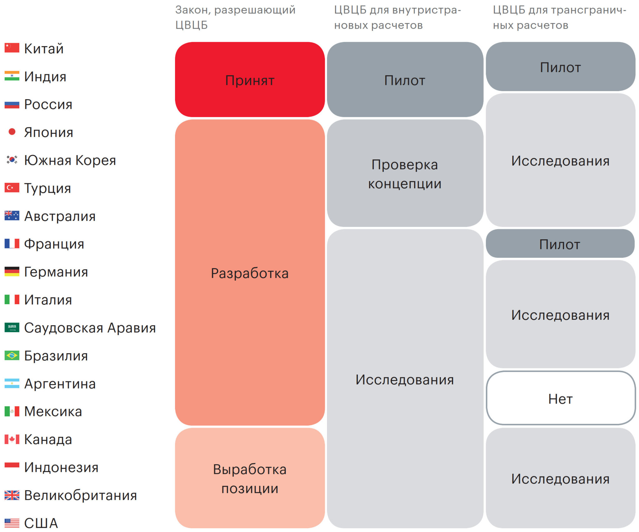Большинство стран уже находятся на различных стадиях развития ЦВЦБ: от исследования до запуска в оборот. Цифровые валюты разрабатывают 130 государств, на чью долю приходится 98% мировой экономики. При этом проектов, направленных на исследование возможностей ЦВЦБ, больше 130. Управляющий партнер Fintech Partners Александр Калякин объясняет это тем, что одни центральные банки самостоятельно разрабатывают технологию, а другие объединяются и проводят совместные исследовательские проекты, направленные на тестирование возможностей ЦВЦБ с точки зрения трансграничных переводов. В результате ряд центральных банков принимают участие сразу в нескольких проектах.