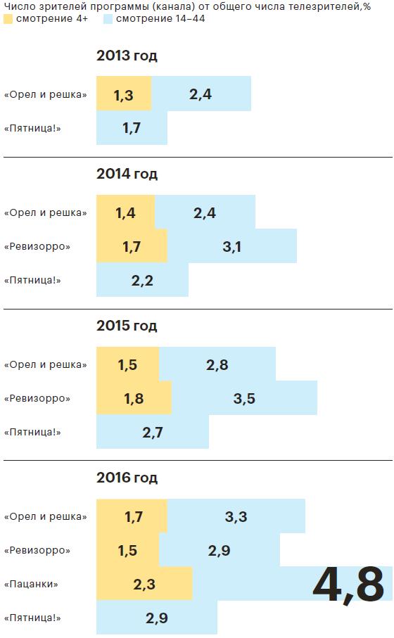 Телеканал «Пятница!» провел 2016 год динамичнее конкурентов: показал самый быстрый на российском рынке темп роста выручки (плюс 21% к 2015 году, до 4,4 млрд руб.) и самую высокую чистую прибыль — 1,1 млрд руб. Главные хиты канала, в огромной степени обеспечившие впечатляющий результат, — шоу «Орел и решка», «Ревизорро» и «Пацанки». У всех программ есть украинские корни: их формат либо полностью придуман в Киеве, либо является совместным творчеством украинских и российских продюсеров. По подсчетам KVG Research, Украина — второй после США поставщик контента для российского телевидения. В 2014 году доля украинского контента составляла 11,9%, по итогам 2016 года — уже 20,5%. Более 70% украинского контента закупают два канала — «Пятница!» и «Ю». В эфире первого программы с украинскими корнями занимают треть эфира, второго — около 40%. Журнал РБК выяснил, кто создает востребованные в России шоу и как удается продолжать сотрудничество во время кризиса в отношениях между двумя странами