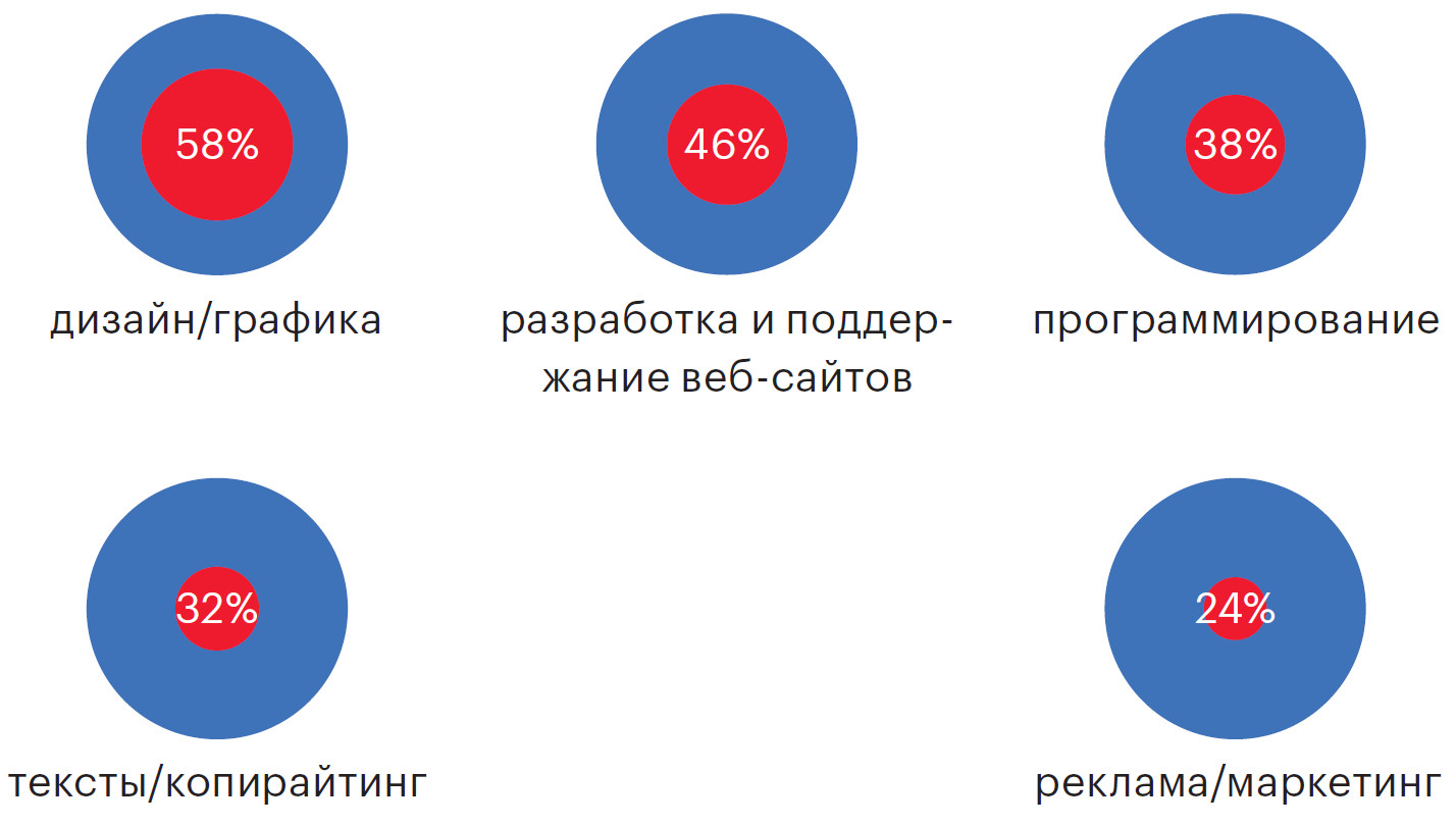 Компании, сотрудничающие с фрилансерами, работают в разных сферах. Чаще всего они занимаются разработкой программного обеспечения, разработкой, поддержкой и продвижением веб-сайтов, дизайном, маркетингом, PR, рекламой, торговлей и промышленным производством (по 10–13%).