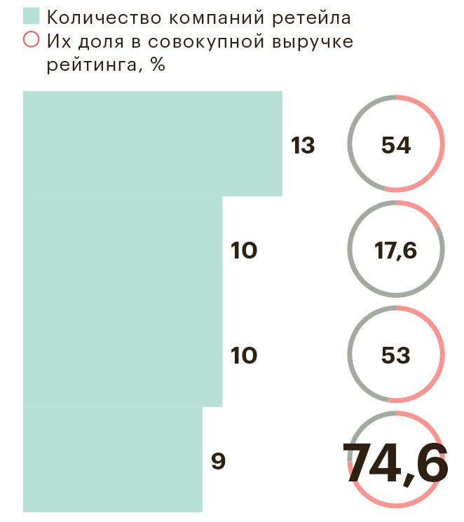 В этом году этот тренд выражен максимально ярко — рейтинг обновился рекордно сильно, из 50 компаний из прошлогоднего списка в новом осталось только семь, и все они представляют розничную торговлю. Во главе «долгожителей» челябинская сеть алкомаркетов «Красное & Белое», единственная компания, которая удержалась в рейтинге быстрорастущих пять лет подряд. Его ближайшие преследователи по числу участия в этих рейтингах — сети «ВкусВилл», Familia и «Лента».