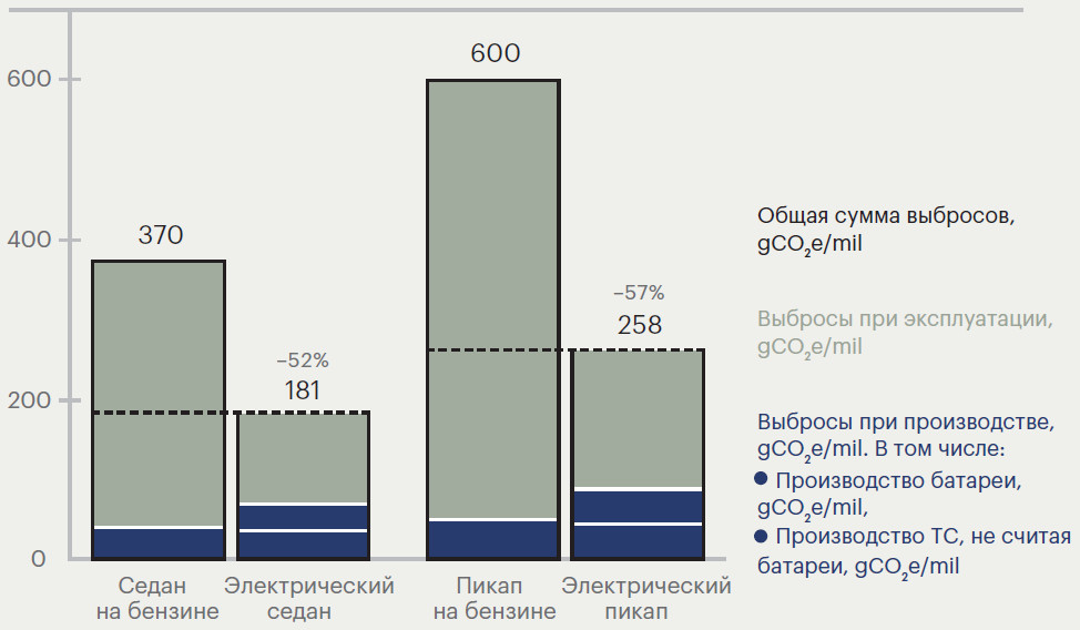 В целом электромобили выигрывают в экологичности перед традиционными машинами, хотя часть «экономии» CO2, достигнутой при эксплуатации ТС на электричестве, компенсируется увеличением выбросов, вызванных его производством и переработкой батареи. Согласно упомянутому исследованию Bloomberg NEF, общий объем выбросов CO2 за весь жизненный цикл электрокара при пробеге 250 тыс. км на 27–71% ниже, чем у автомобиля с обычным двигателем.