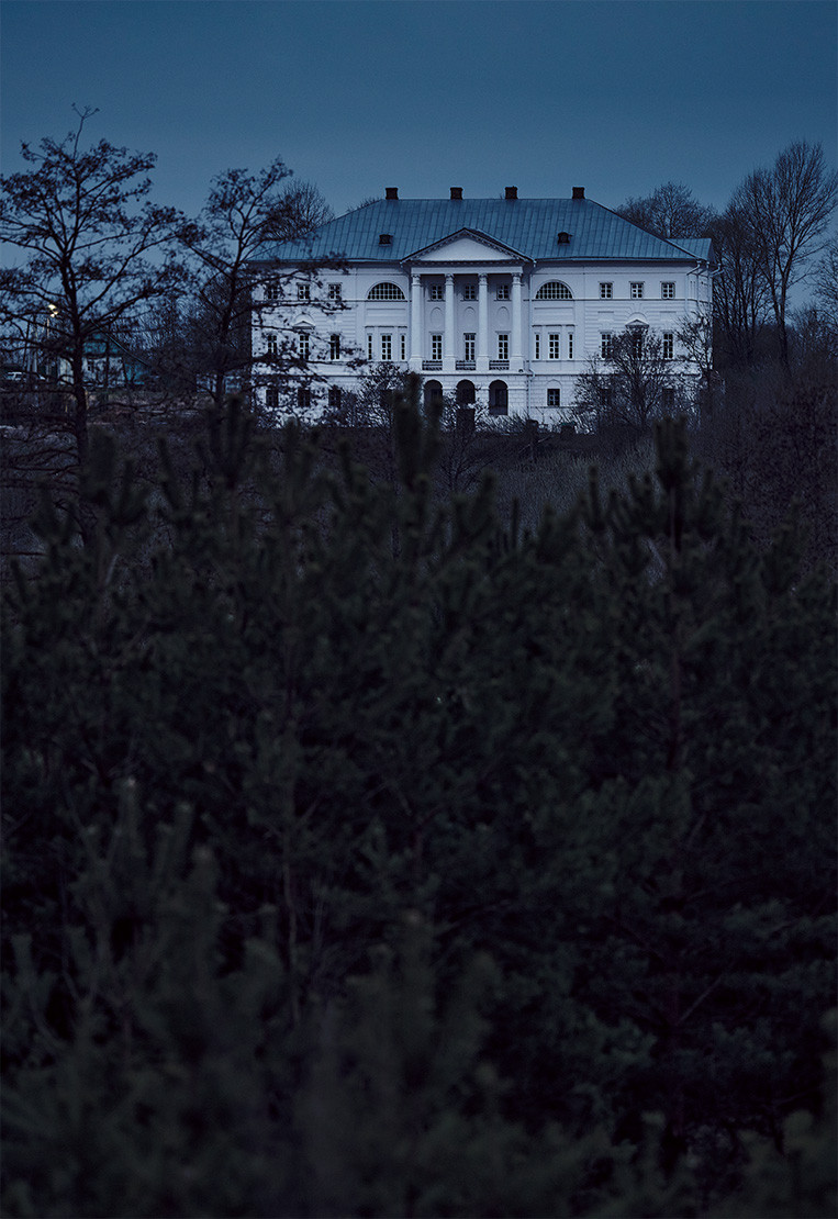 Аня Сенатова, куратор фестиваля современного искусства «Циолковский Фест» в Калуге, привезла меня в усадьбу и сказала: «Подумай. Мне кажется, тебя это место равнодушной не оставит». Несколько лет назад школу закрыли, чтобы здание отреставрировать, но работы так и не начались, и усадьба медленно умирала. Она единственная уцелела на разгромленном в войну Полотняном заводе, но теперь была заброшена и всеми забыта, как нелюбимый внебрачный ребенок.
