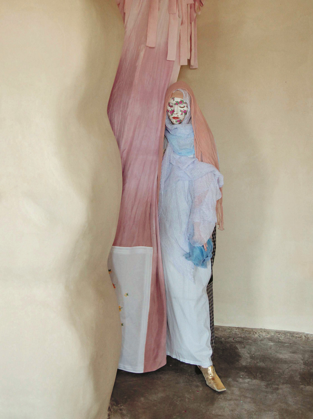 Люди приезжали из других городов, оставались гостить и помогать на открытии, угощались домашним лавашом и сыром, становились новыми друзьями и частью пространства. Художница из Петербурга Ксюша Мацкевич была у Асии уже через несколько недель после знакомства, расписывала кофейные столики и вешалки. Ребристый дубовый стеллаж, будто из обзора Maison&Objet, вручную вытачивал местный плотник Гусейн Магомедов из села Унцукуль. Цветочные принты на потолке — работы художницы Оли Шурыгиной. За ткани для примерочной и молитвенной зоны отвечала художница и дизайнер одежды Даша Уркинеева. Двустороннее зеркало в стене — работа художницы Саши Минер, соосновательницы бренда murky_objects. Так в стенах одного пространства встретились современные городские художники и кавказские ремесленники.