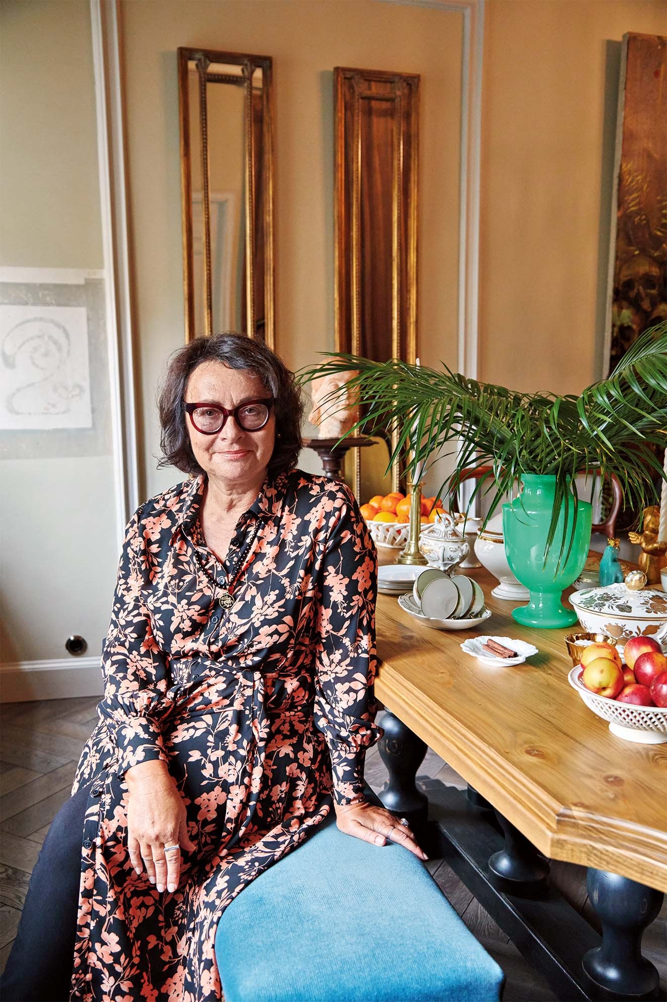«Когда я покупала квартиру, я понятия не имела, что здесь обнаружится под слоями масляной краски. Это была абсолютно руинированная коммуналка, никаких росписей видно не было. Когда я поняла, что скрывается под слоями краски, я обратилась к реставраторам, они предложили метод ленточной очистки — от пола до потолка (а это 4,20 метров) чистится полоса шириной 10 сантиметров, чтобы посмотреть, что там. Сделали так в каждой комнате. И в каждой оказались абсолютно разные альфрейные росписи. На тот момент у меня уже был готов проект, закуплены материалы. Конечно, мой бюджет не был рассчитан на реставрационные работы… Но и оставить это просто так я не могла. В итоге решила в каждой комнате расчистить хоть по чуть-чуть, чтоб показать, как это было». Любуясь терракотовой прихожей, голубым кабинетом, зелено-розовой кухней и гризайлевой гостиной и глядя на фотографии «до», восхищаешься терпением Елены. В общей сложности ремонт длился 3,5 года. Под найденные росписи она подобрала максимально подходящие по тону краски и материалы, обставила квартиру собственной коллекцией антиквариата, которую собирала много лет по всему миру, развесила живопись, проводит камерные выставки «Жизнь с искусством», изредка приглашает гостей, которым интересно послушать истории о необычной квартире. А их у Елены много.