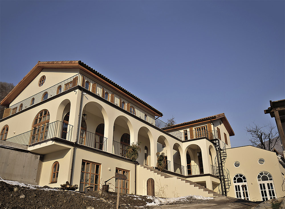 Идея дома, который будет открыт для людей, появилась у Юли, еще когда они с мужем жили в Перми. Потом ребята решили переехать в место с более мягким климатом — так случилась встреча с Красной Поляной. Увидев из окна гостиницы горы, они сказали друг другу: «Кажется, мы нашли наше место». Этот участок с речкой и видом на горы риелтор показал в последнюю очередь. «Мне даже не нужно было заходить на территорию. Я подошла к воротам, села на лавочке и поняла: это место — здесь. Спустя два месяца мы купили эту землю», — рассказывает Юля.