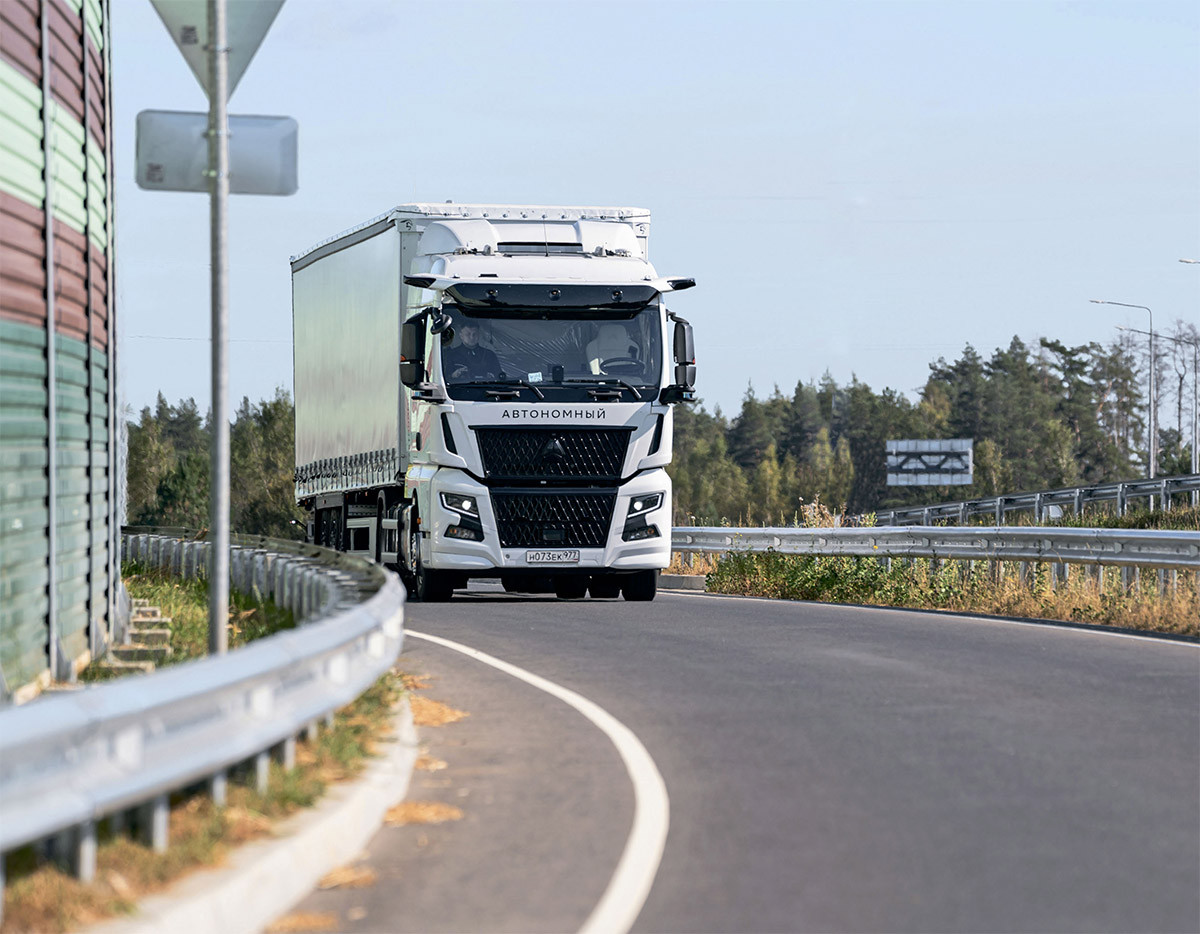 Если вы встретите на трассе беспилотный седельный тягач с полуприцепом, то с первого взгляда вряд ли поймете, что им управляет компьютер. Тем более что на водительском месте сидит человек. Но если приглядеться, можно увидеть выделяющиеся на фоне кабины элементы сенсорсета (лидары, радары, камеры) и надпись «автономный».