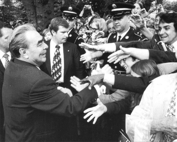 Летом 1974 года Леонид Ильич Брежнев нанес ответный визит вежливости президенту США — за год до этого Никсон посетил СССР. Встреча состоялась в Вашингтоне, где дружелюбные американские граждане смогли дотянуться до советского лидера. Этот момент и запечатлел фотограф.