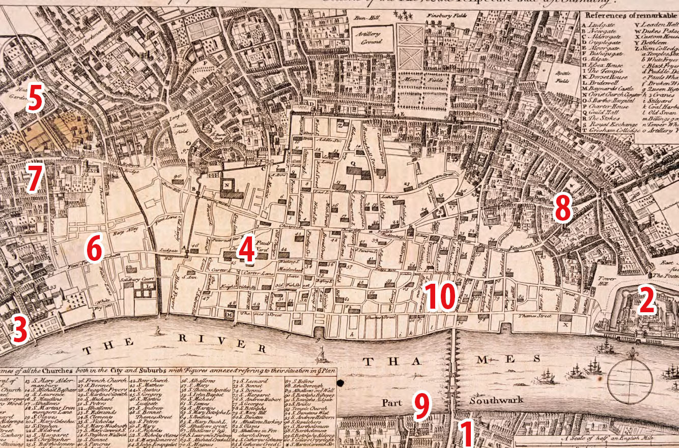 1. Tabard Inn. Таверна «Табар», открытая в 1307 году, находилась на южном берегу Темзы в Саутварке, на Боро-Хай-стрит. В ней часто останавливались паломники, отправляющиеся в Кентербери и Дувр, о чем писал еще Джеффри Чосер. Хотя в 1666 году огонь не смог перебраться через Темзу, таверна сгорела спустя десять лет в Саутваркском пожаре, но затем была отстроена заново.